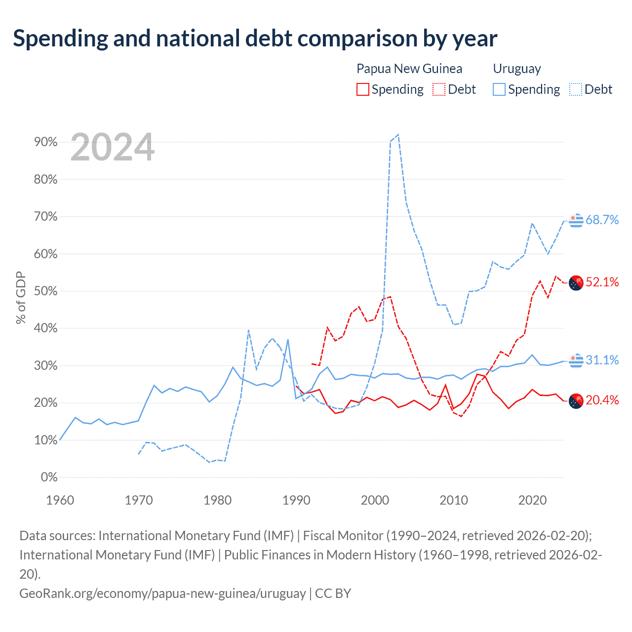Papua New Guinea has $16.6B in government debt (52.1% of GDP), compared to $55.6B (68.7% of GDP) in Uruguay.