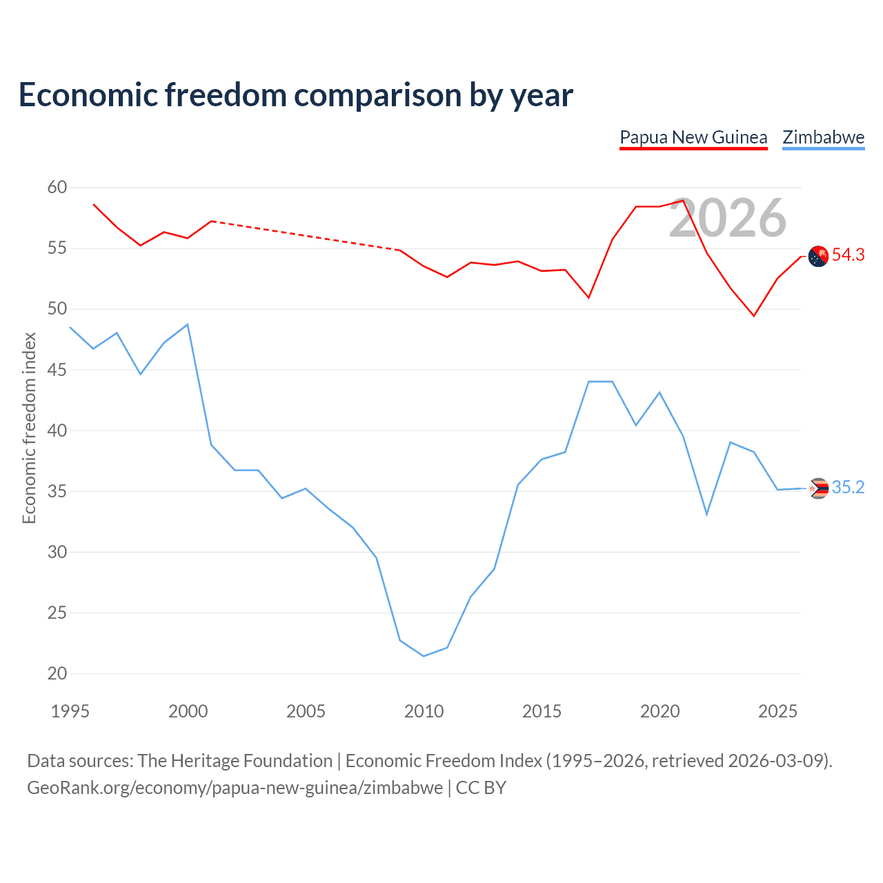 The Economic Freedom Index for Papua New Guinea is 54.3, ranking 134/197, compared to 35.2 for Zimbabwe, ranking 190/197. The chart above displays a comparison of annual changes in economic freedom indexes.