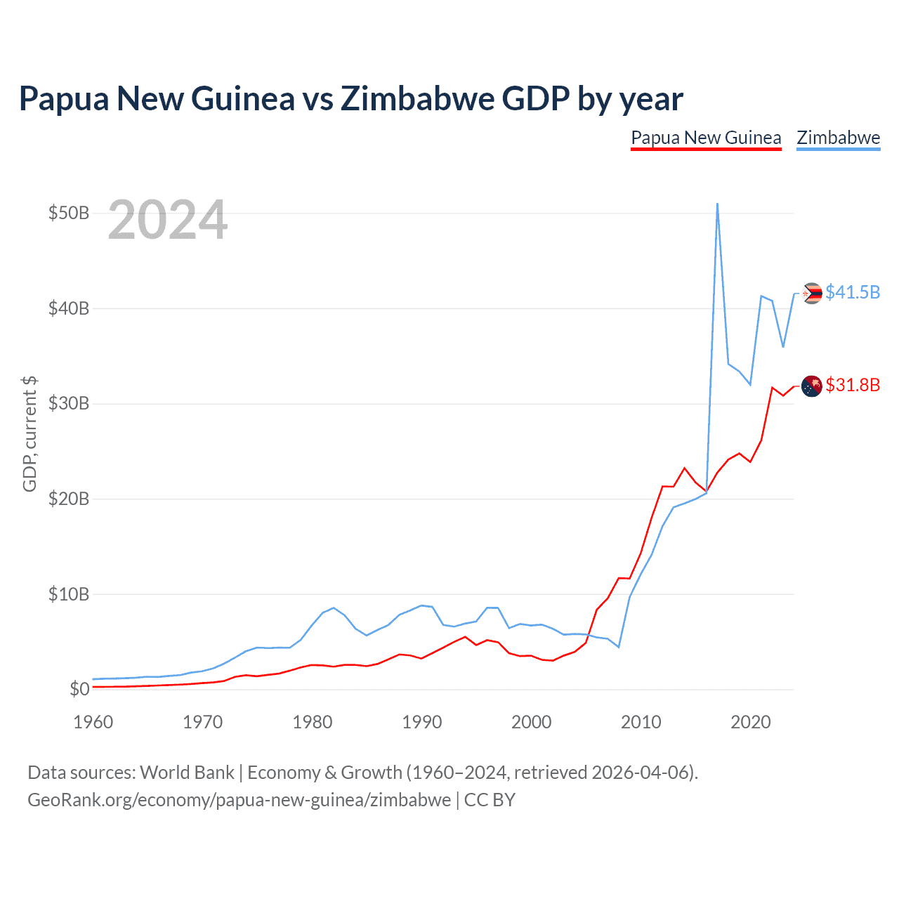 Papua New Guinea has a GDP of $31.8B compared to $41.5B for Zimbabwe, ranking 110/197 and 102/197 by economy size, respectively.