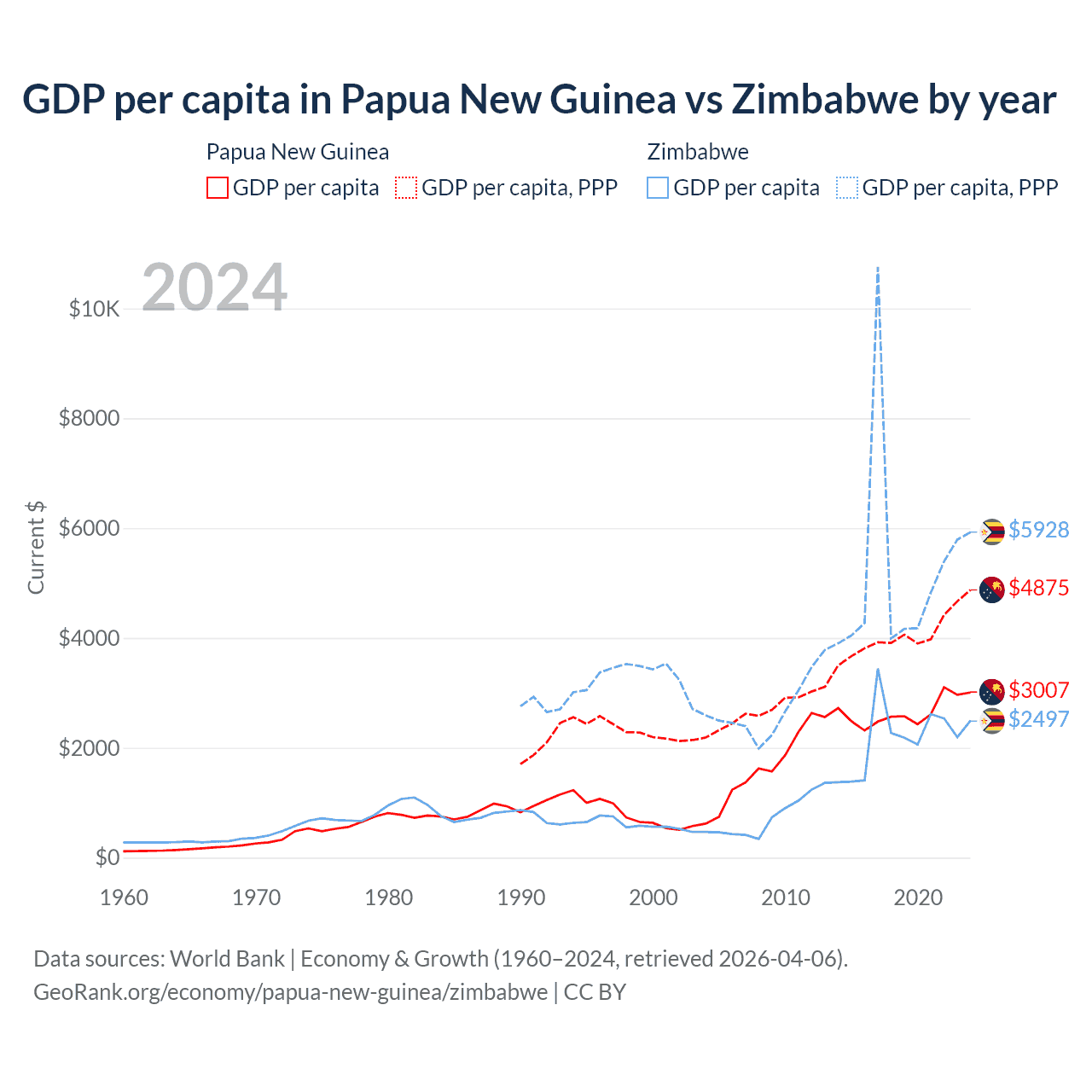 GDP per capita in Papua New Guinea vs Zimbabwe by year