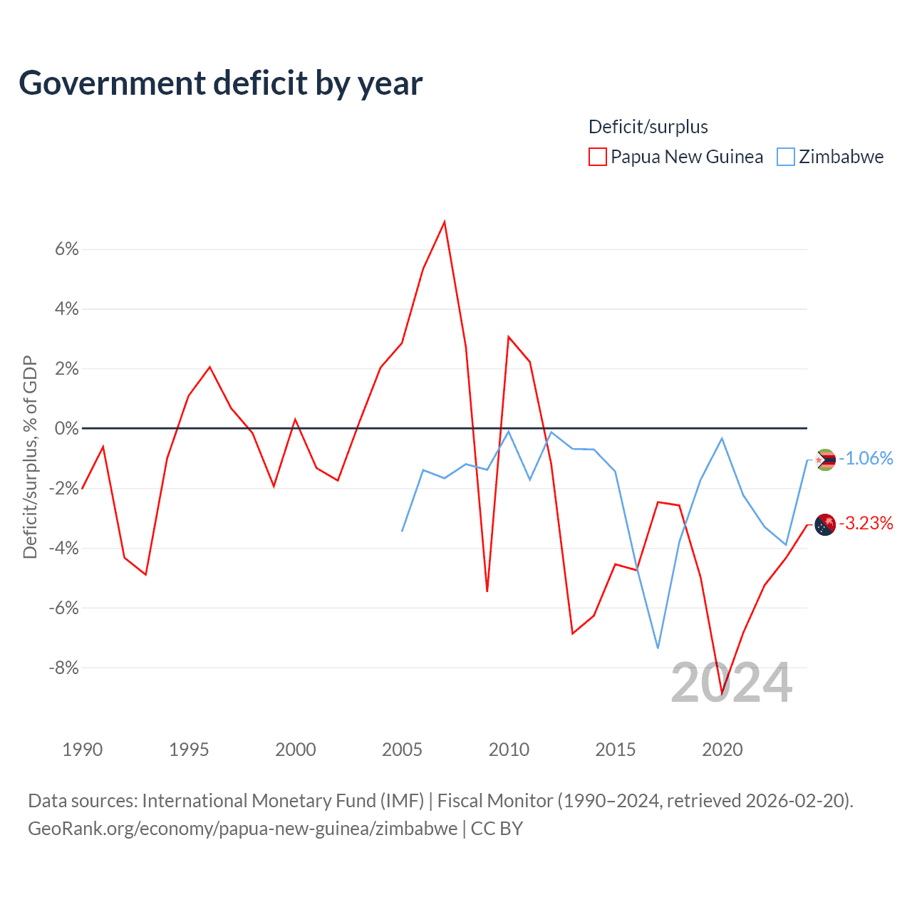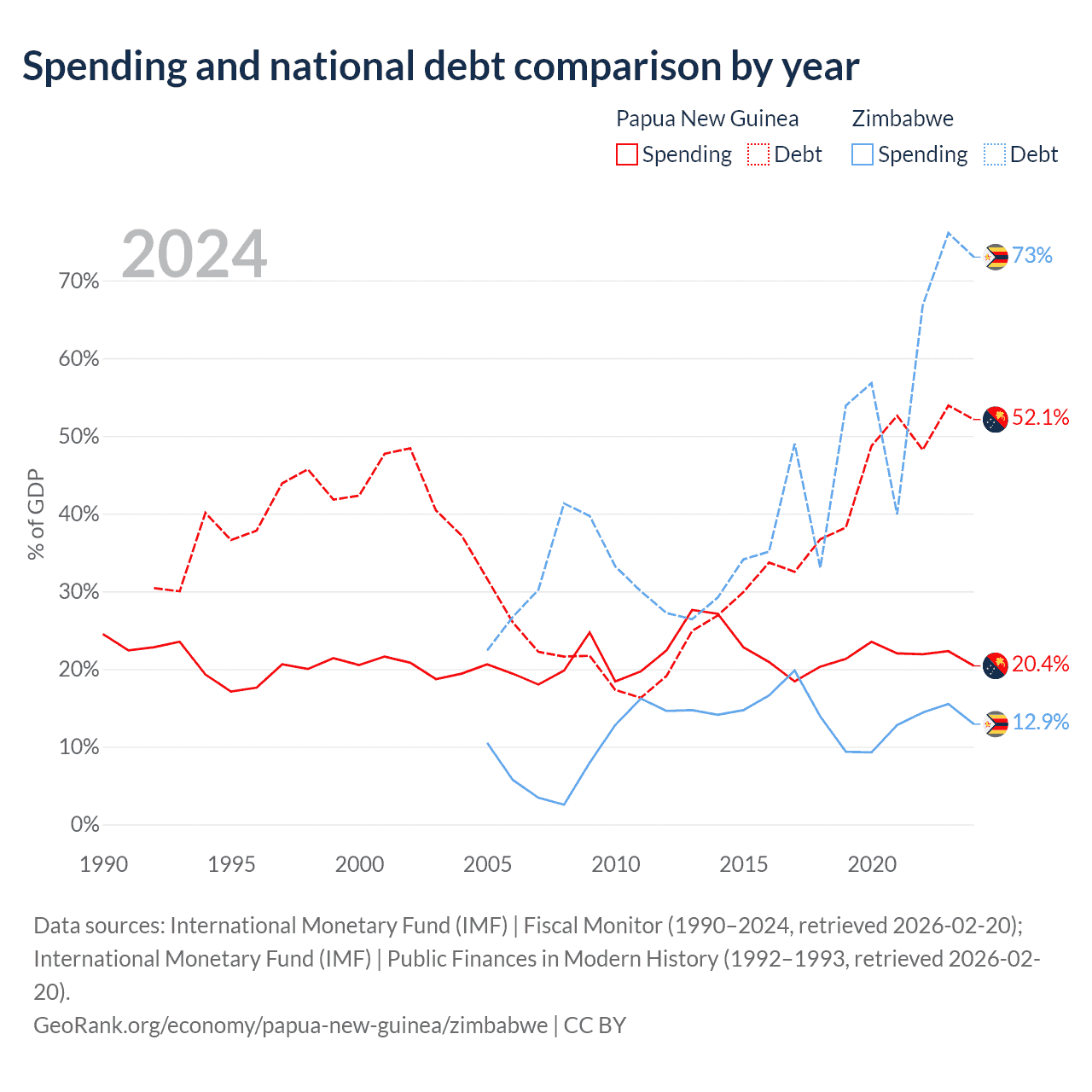 Papua New Guinea has $16.6B in government debt (52.1% of GDP), compared to $30.3B (73% of GDP) in Zimbabwe.