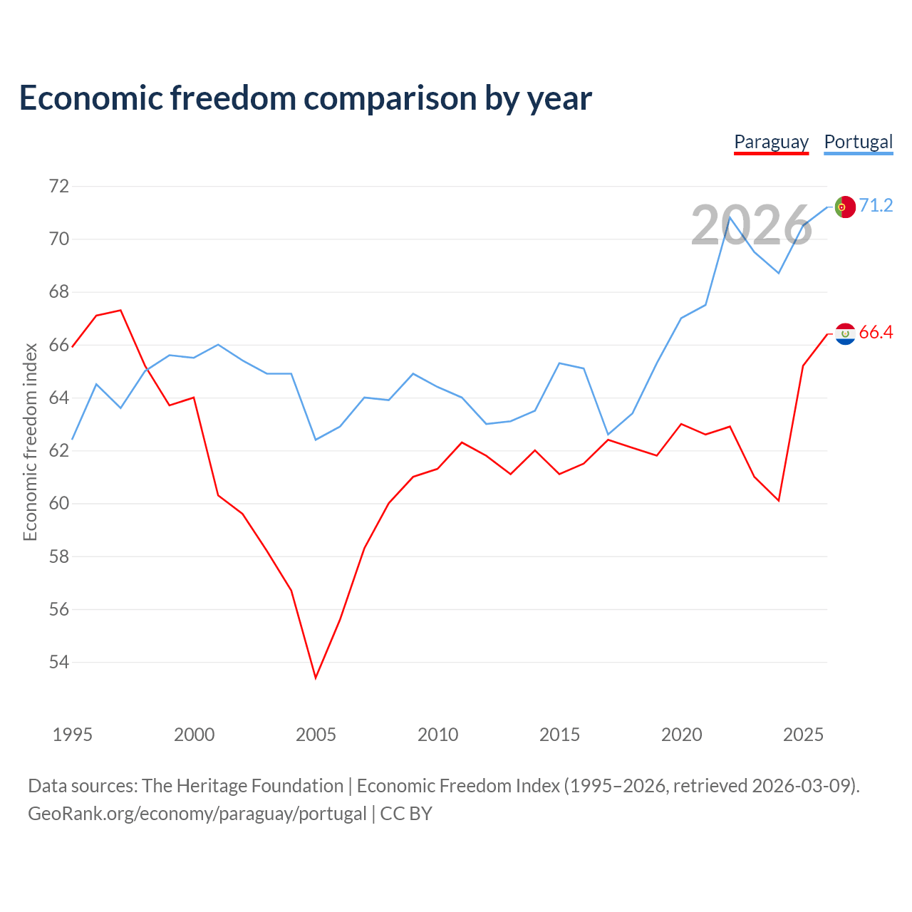 The Economic Freedom Index for Paraguay is 66.4, ranking 61/197, compared to 71.2 for Portugal, ranking 33/197. The chart above displays a comparison of annual changes in economic freedom indexes.