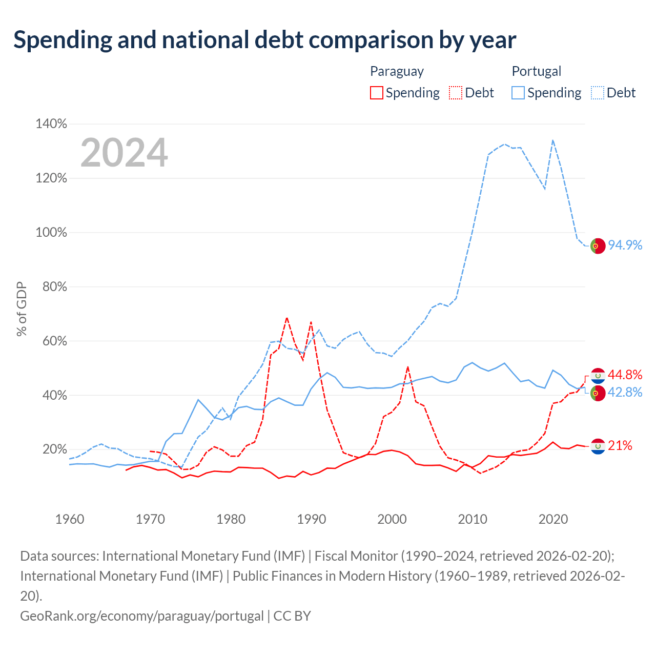 Paraguay has $19.9B in government debt (44.8% of GDP), compared to $297B (94.9% of GDP) in Portugal.