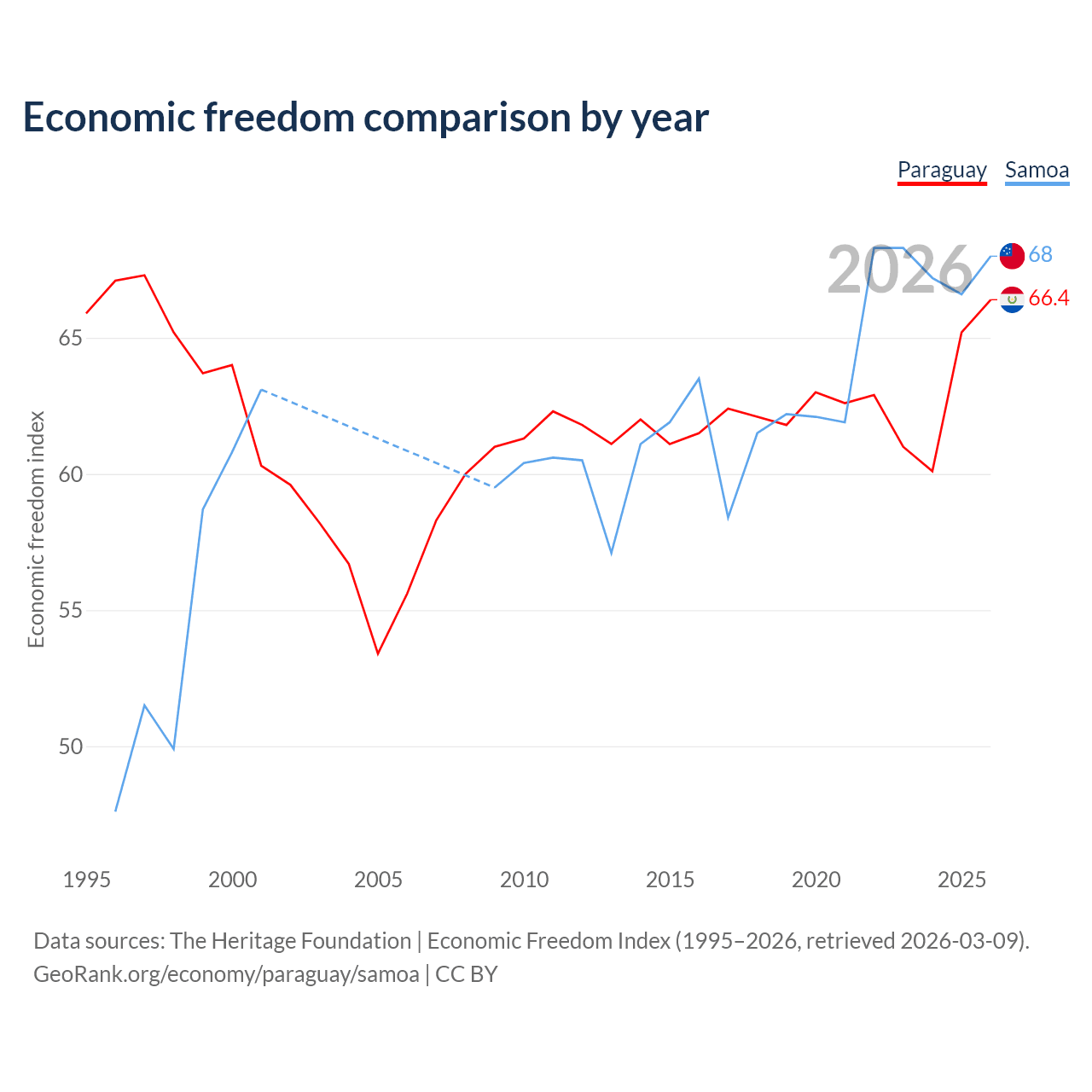 The Economic Freedom Index for Paraguay is 66.4, ranking 61/197, compared to 68 for Samoa, ranking 52/197. The chart above displays a comparison of annual changes in economic freedom indexes.