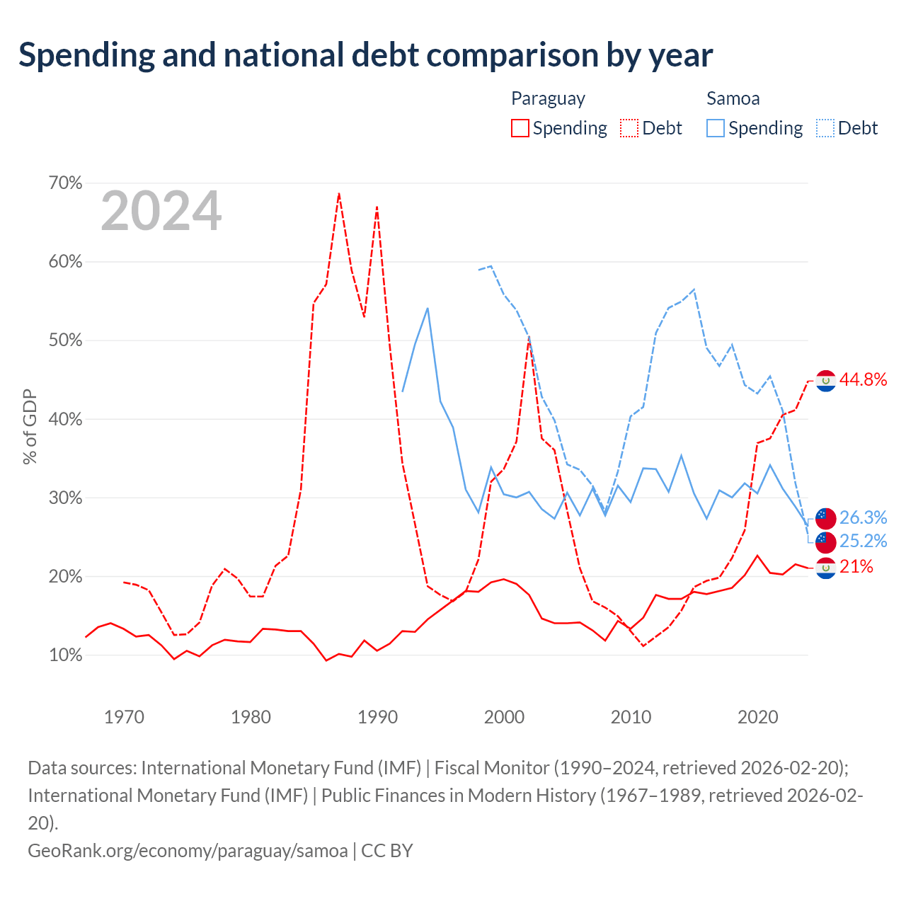 Paraguay has $19.9B in government debt (44.8% of GDP), compared to $296M (25.2% of GDP) in Samoa.