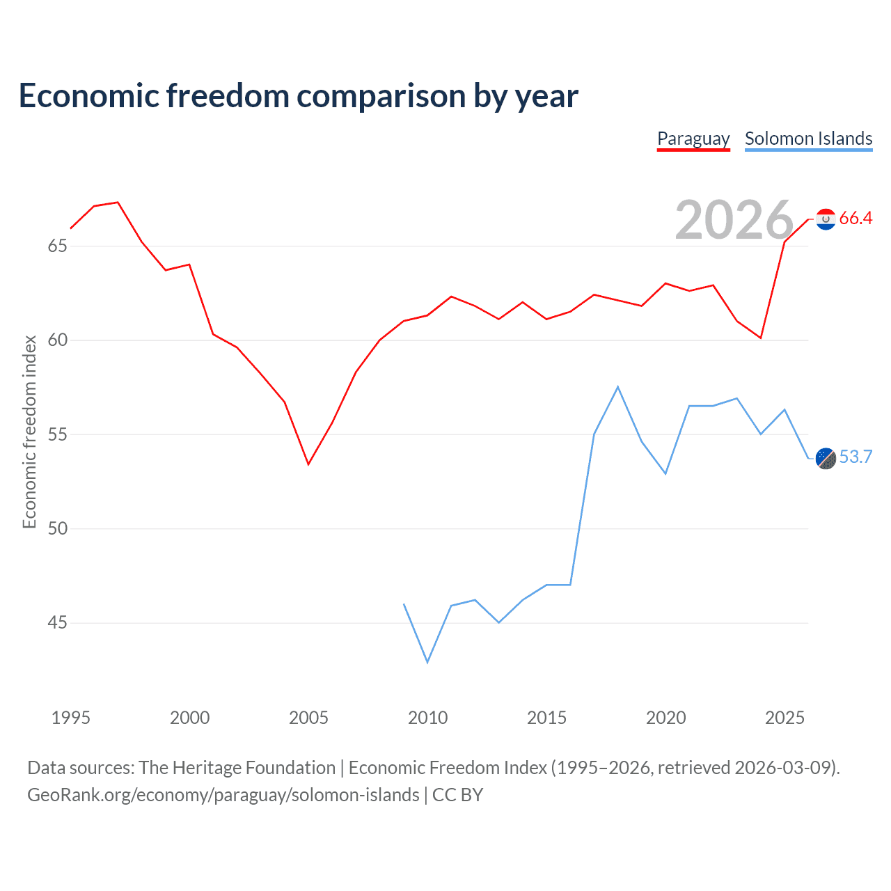 The Economic Freedom Index for Paraguay is 66.4, ranking 61/197, compared to 53.7 for the Solomon Islands, ranking 137/197. The chart above displays a comparison of annual changes in economic freedom indexes.