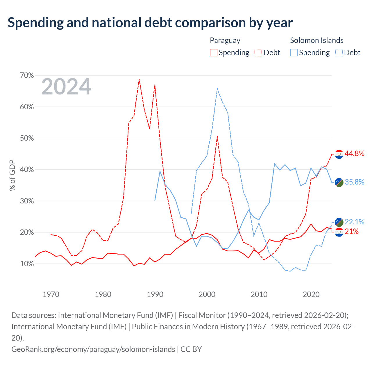 Paraguay has $19.9B in government debt (44.8% of GDP), compared to $350M (22.1% of GDP) in the Solomon Islands.