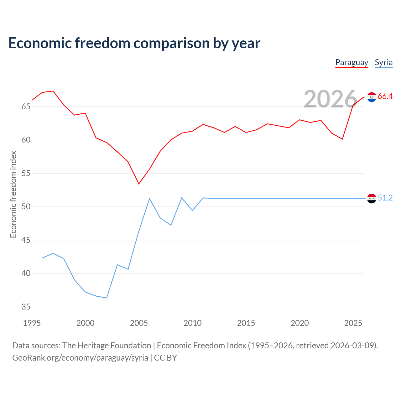 The Economic Freedom Index for Paraguay is 66.4, ranking 61/197, compared to 51.2 for Syria, ranking 155/197. The chart above displays a comparison of annual changes in economic freedom indexes.