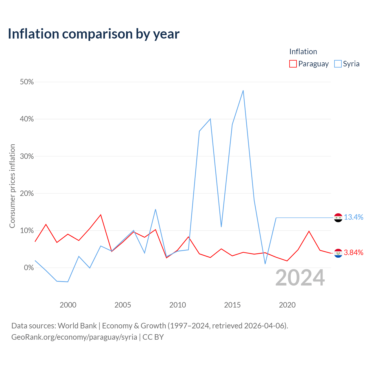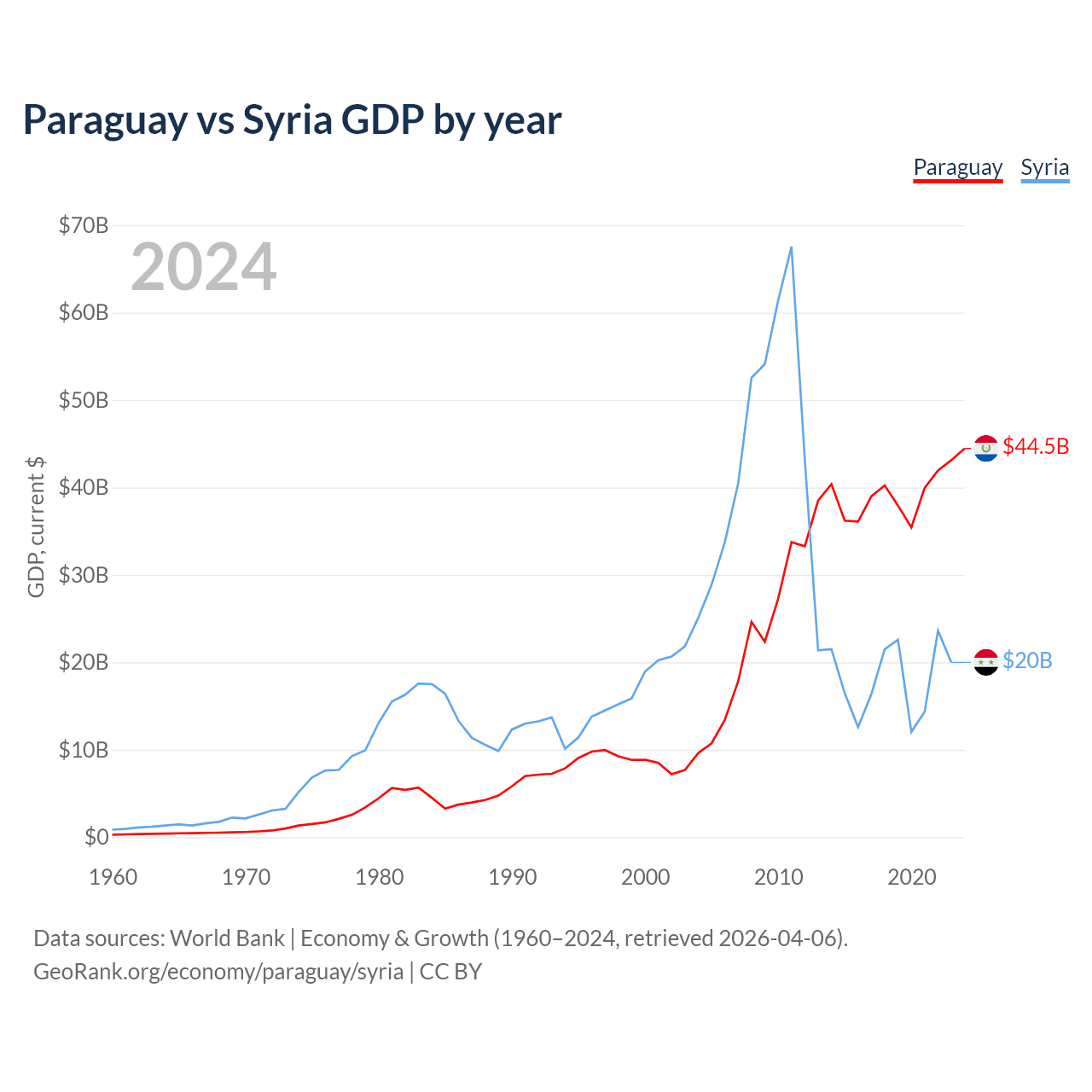 Paraguay has a GDP of $44.5B compared to $20B for Syria, ranking 98/197 and 129/197 by economy size, respectively.