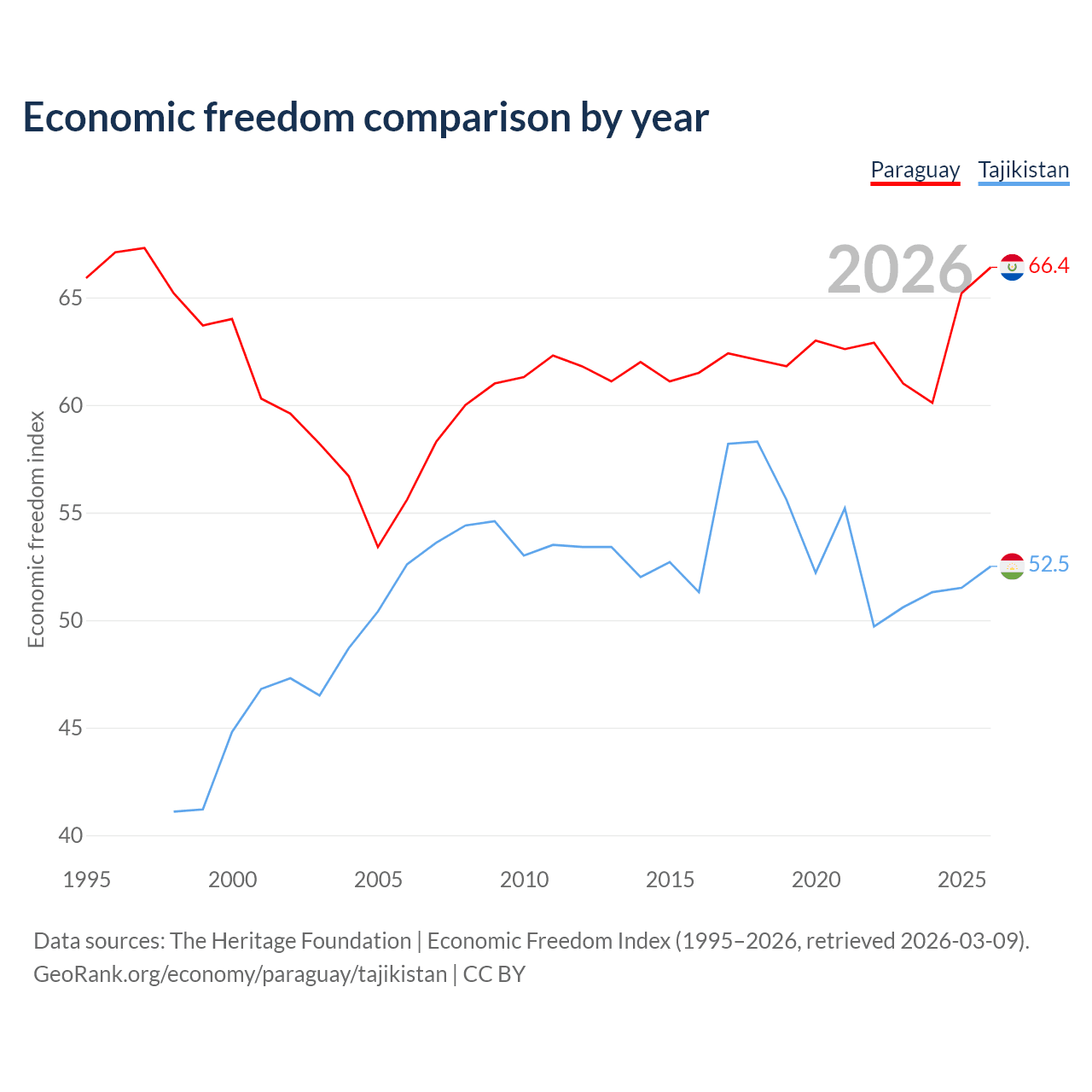 The Economic Freedom Index for Paraguay is 66.4, ranking 61/197, compared to 52.5 for Tajikistan, ranking 147/197. The chart above displays a comparison of annual changes in economic freedom indexes.