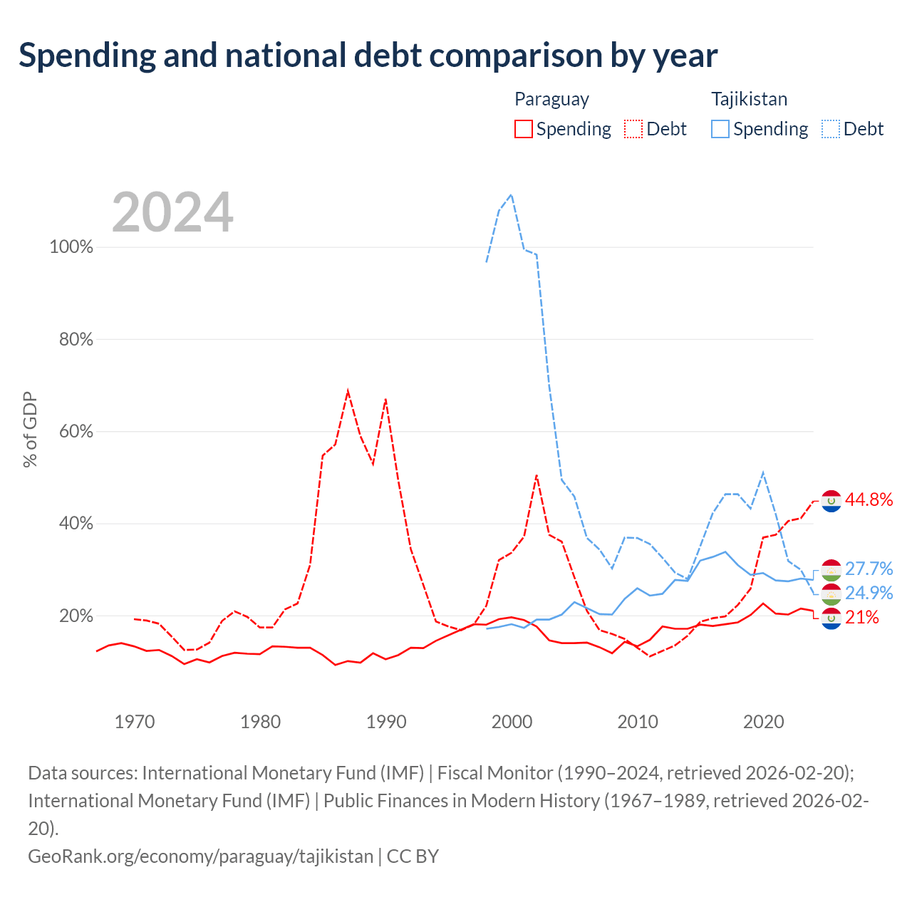 Paraguay has $19.9B in government debt (44.8% of GDP), compared to $3.54B (24.9% of GDP) in Tajikistan.
