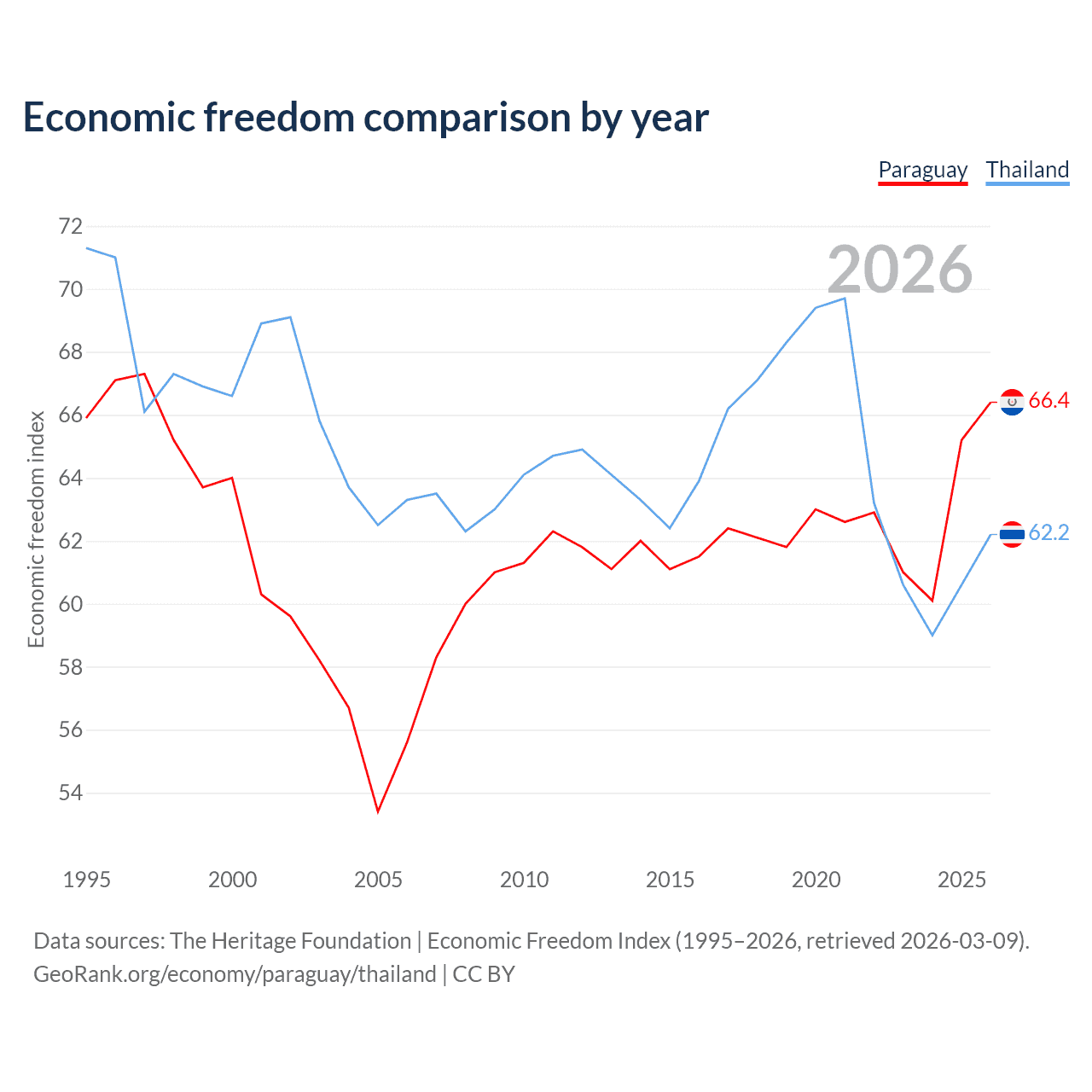 The Economic Freedom Index for Paraguay is 66.4, ranking 61/197, compared to 62.2 for Thailand, ranking 88/197. The chart above displays a comparison of annual changes in economic freedom indexes.