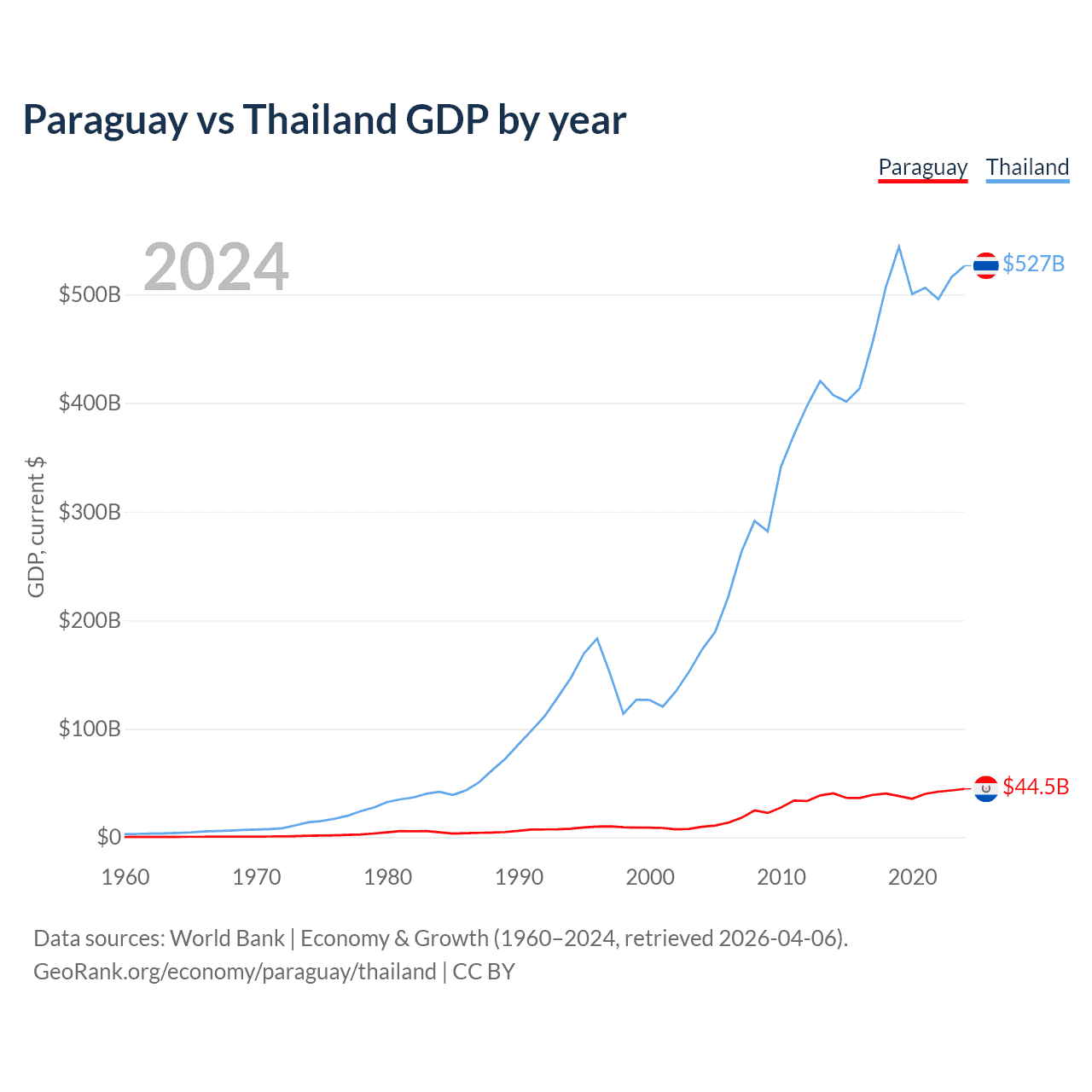 Paraguay has a GDP of $44.5B compared to $527B for Thailand, ranking 98/197 and 31/197 by economy size, respectively.