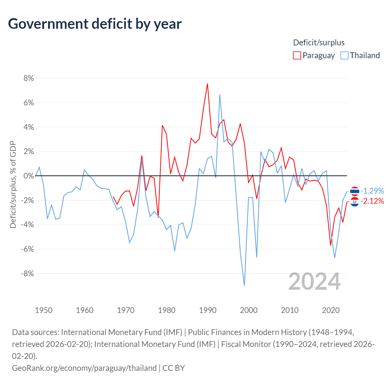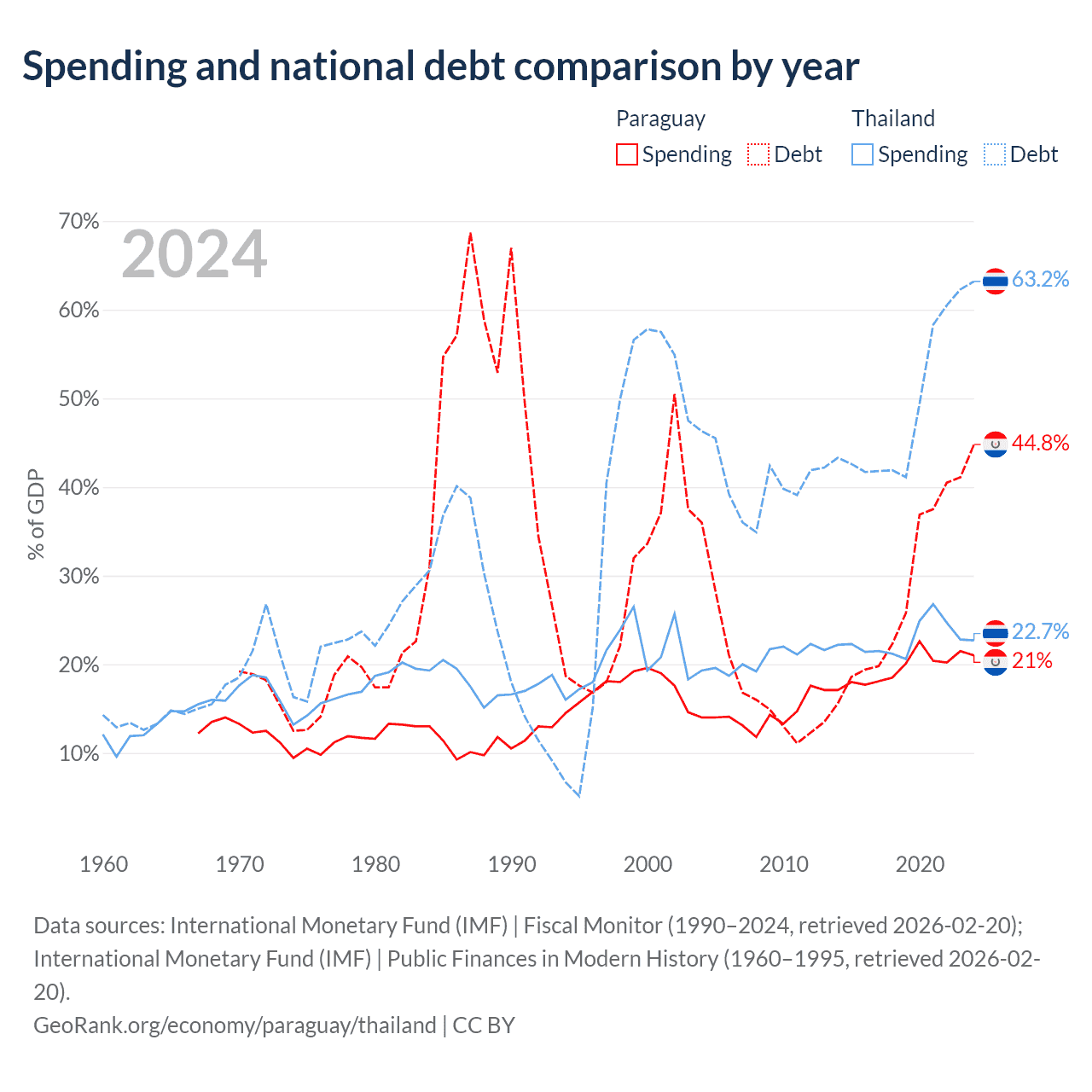 Paraguay has $19.9B in government debt (44.8% of GDP), compared to $333B (63.2% of GDP) in Thailand.