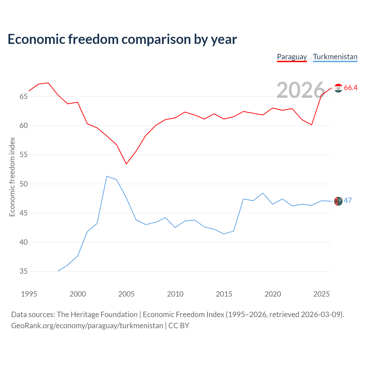 The Economic Freedom Index for Paraguay is 66.4, ranking 61/197, compared to 47 for Turkmenistan, ranking 177/197. The chart above displays a comparison of annual changes in economic freedom indexes.
