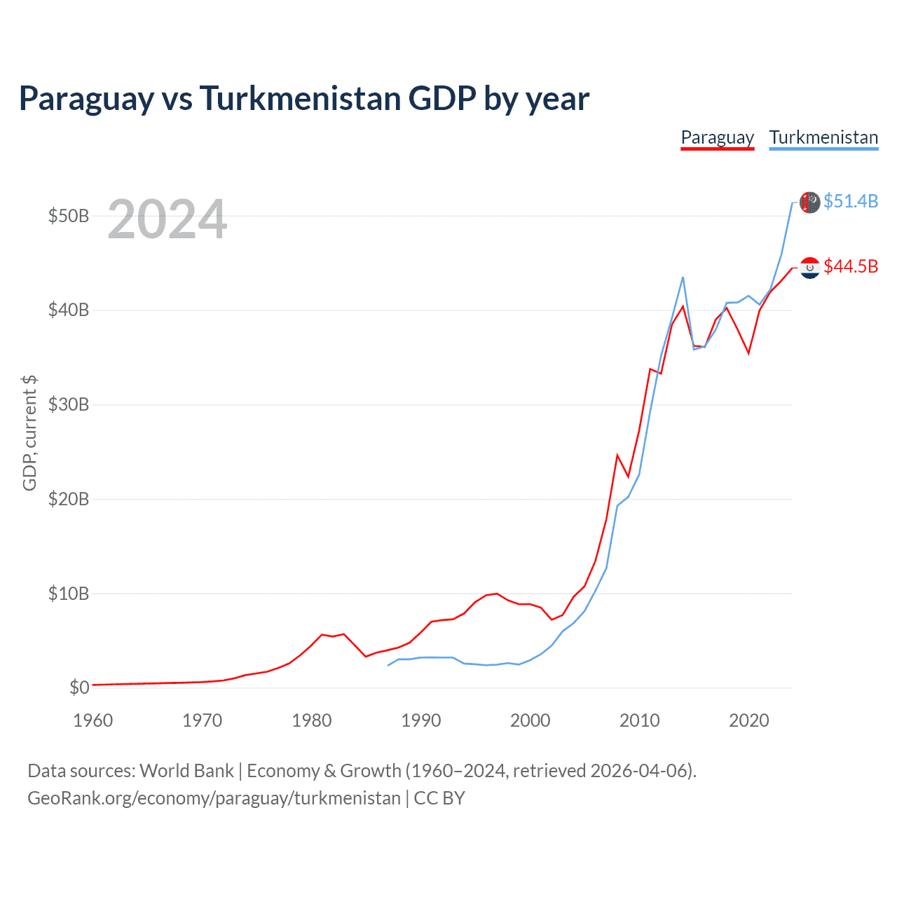 Paraguay has a GDP of $44.5B compared to $51.4B for Turkmenistan, ranking 98/197 and 92/197 by economy size, respectively.