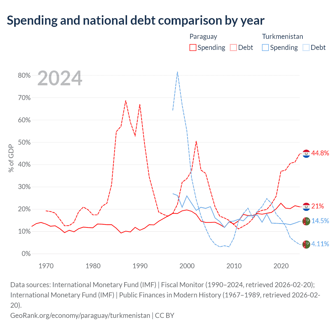 Paraguay has $19.9B in government debt (44.8% of GDP), compared to $2.11B (4.11% of GDP) in Turkmenistan.