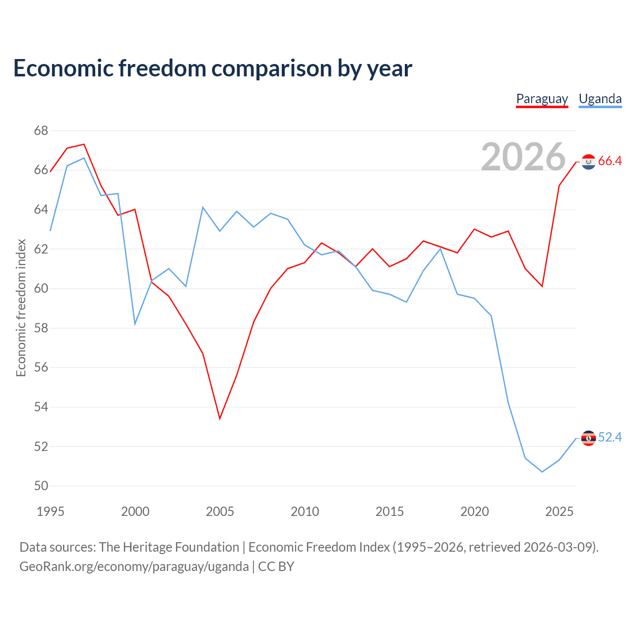 The Economic Freedom Index for Paraguay is 66.4, ranking 61/197, compared to 52.4 for Uganda, ranking 149/197. The chart above displays a comparison of annual changes in economic freedom indexes.