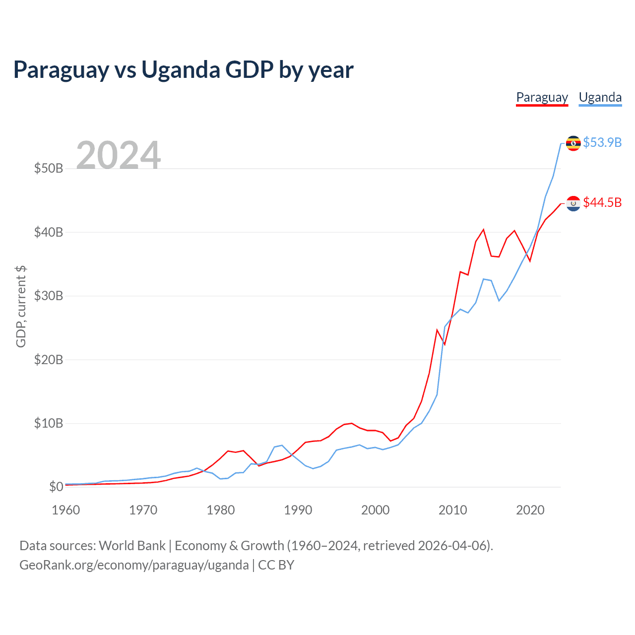 Paraguay has a GDP of $44.5B compared to $53.9B for Uganda, ranking 98/197 and 89/197 by economy size, respectively.