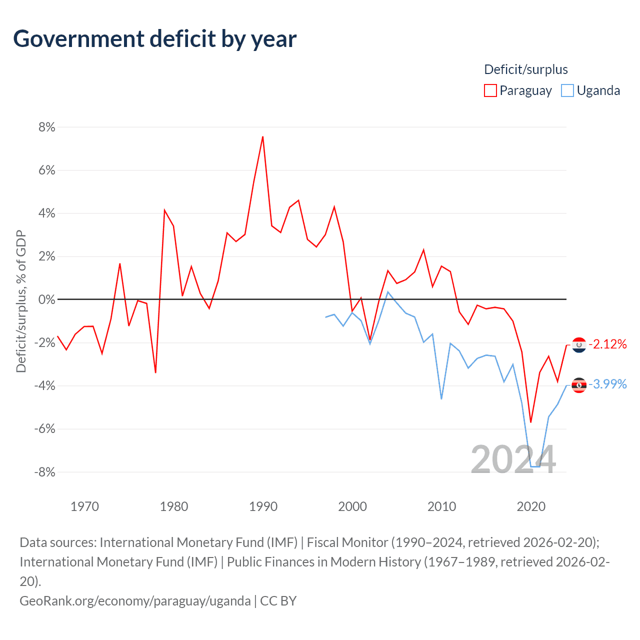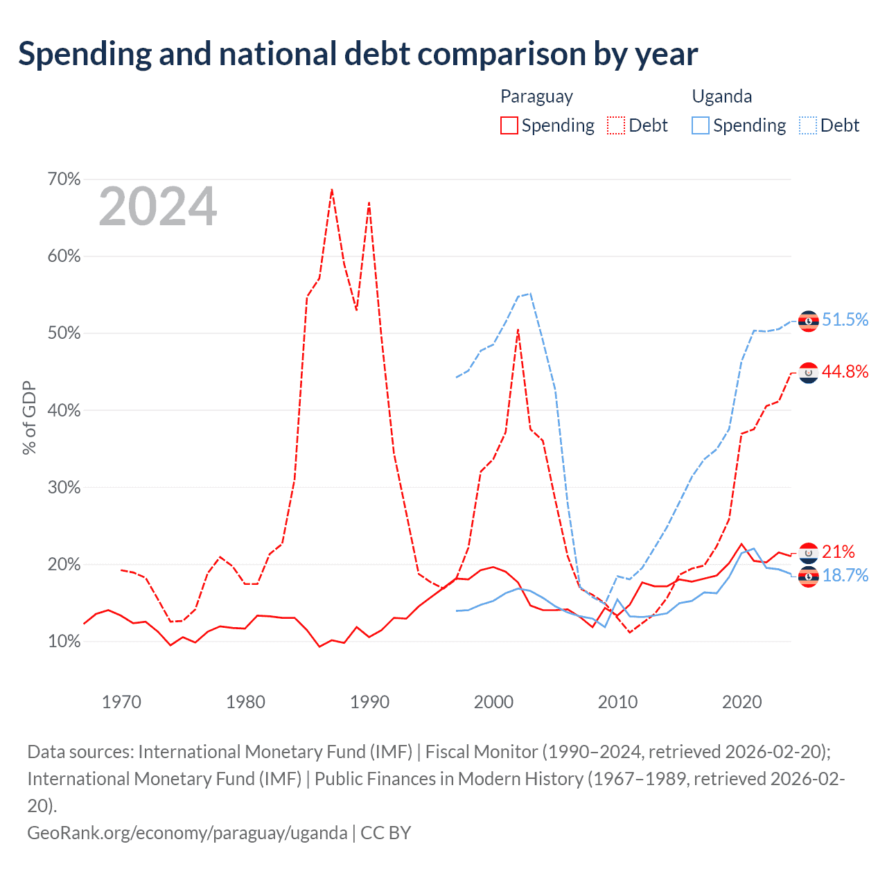 Paraguay has $19.9B in government debt (44.8% of GDP), compared to $27.8B (51.5% of GDP) in Uganda.
