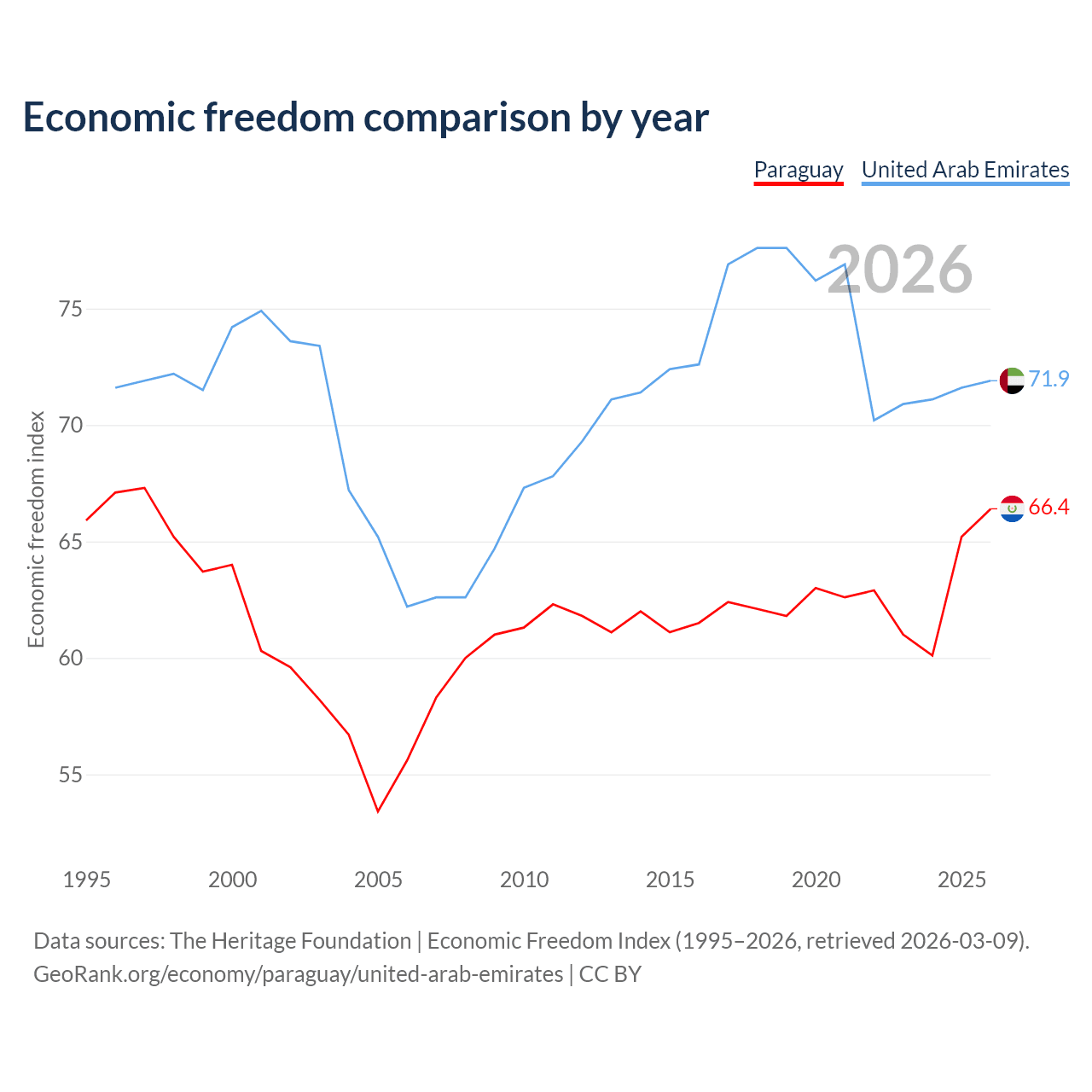Data sources: The Heritage Foundation | Economic Freedom Index (1995–2026, retrieved 2026-03-09).