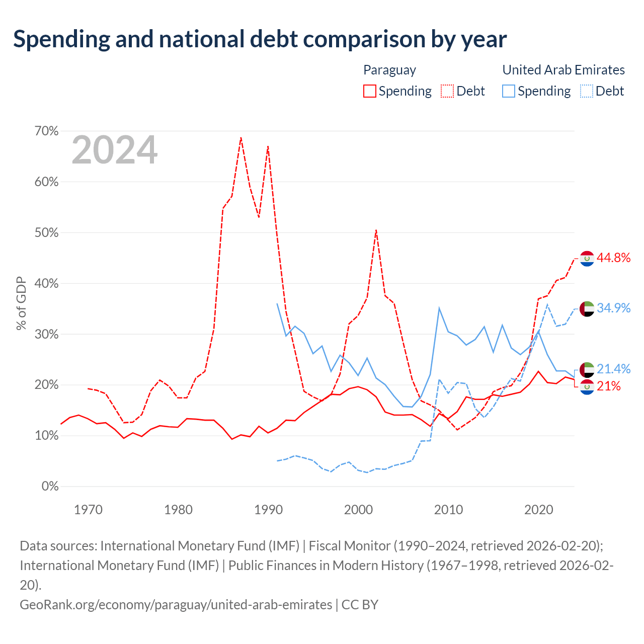 Paraguay has $19.9B in government debt (44.8% of GDP), compared to $193B (34.9% of GDP) in the United Arab Emirates.