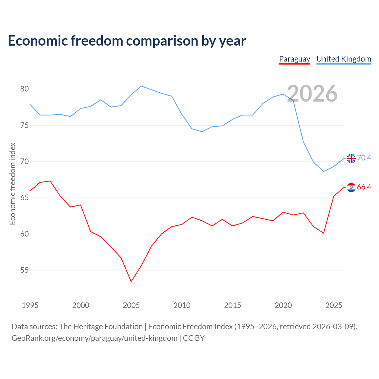The Economic Freedom Index for Paraguay is 66.4, ranking 61/197, compared to 70.4 for the United Kingdom, ranking 35/197. The chart above displays a comparison of annual changes in economic freedom indexes.