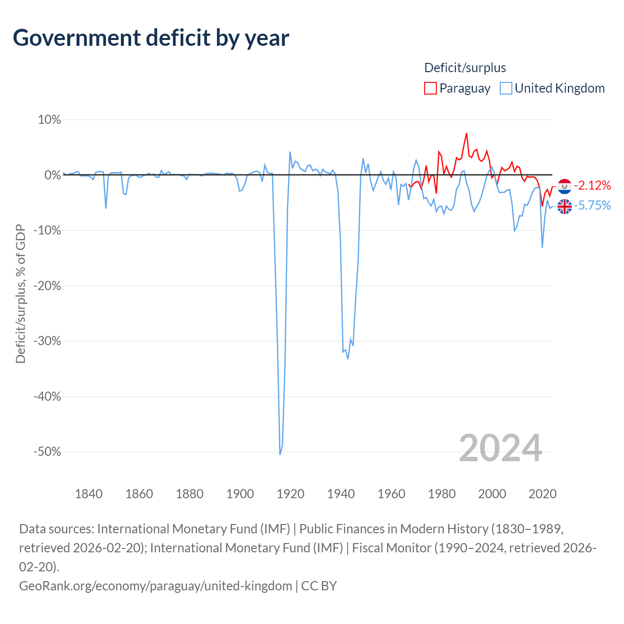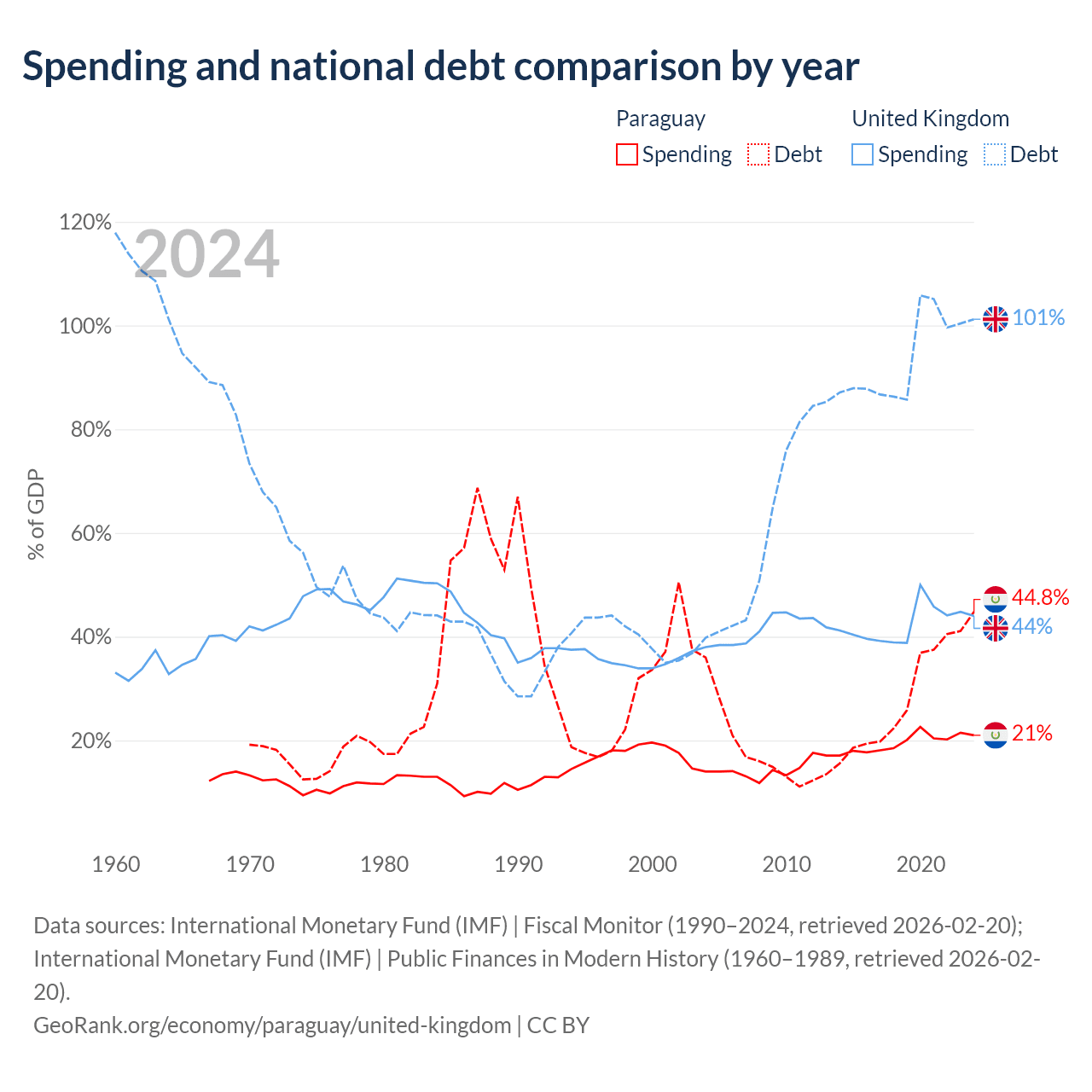 Paraguay has $19.9B in government debt (44.8% of GDP), compared to $3.73T (101.2% of GDP) in the United Kingdom.