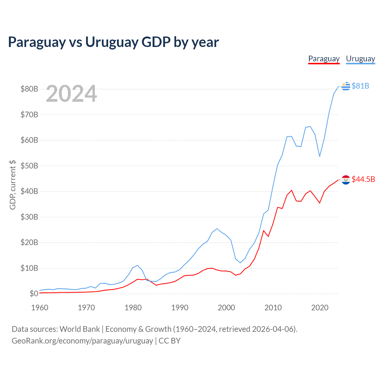 Paraguay has a GDP of $44.5B compared to $81B for Uruguay, ranking 98/197 and 81/197 by economy size, respectively.