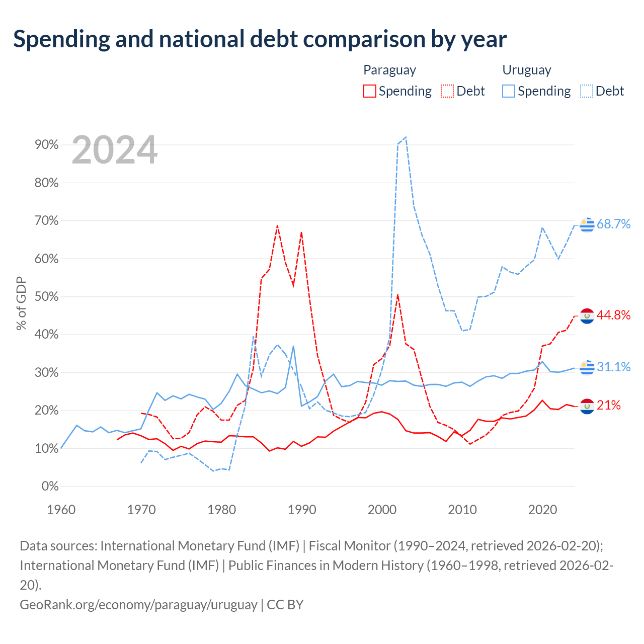 Paraguay has $19.9B in government debt (44.8% of GDP), compared to $55.6B (68.7% of GDP) in Uruguay.