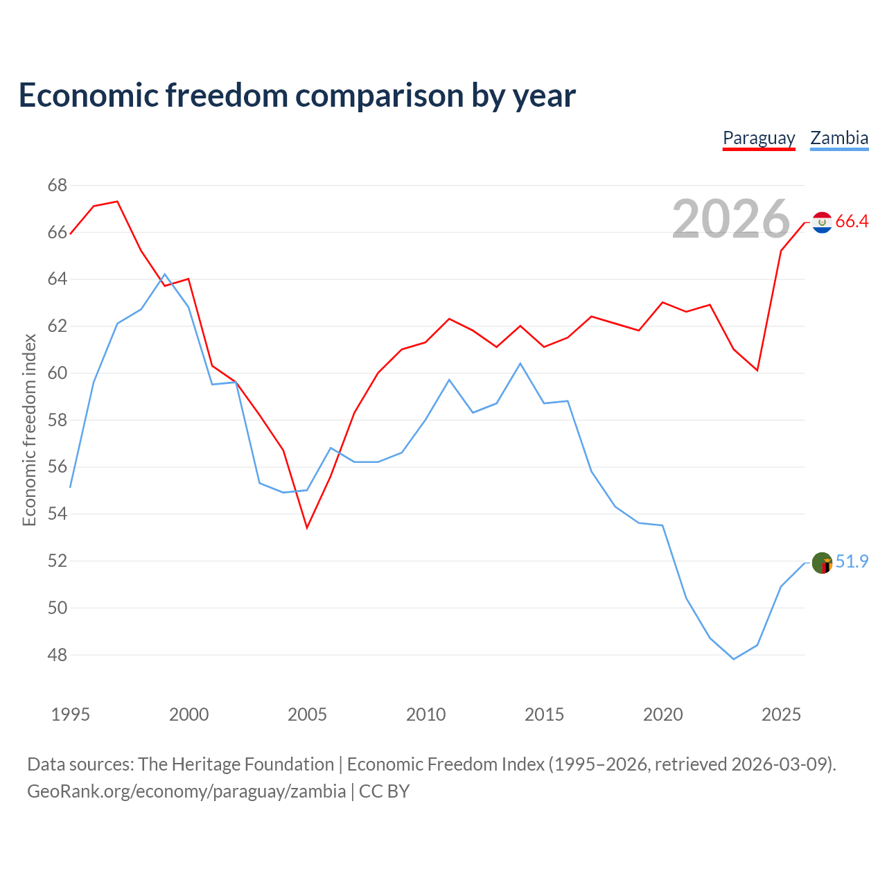 The Economic Freedom Index for Paraguay is 66.4, ranking 61/197, compared to 51.9 for Zambia, ranking 152/197. The chart above displays a comparison of annual changes in economic freedom indexes.