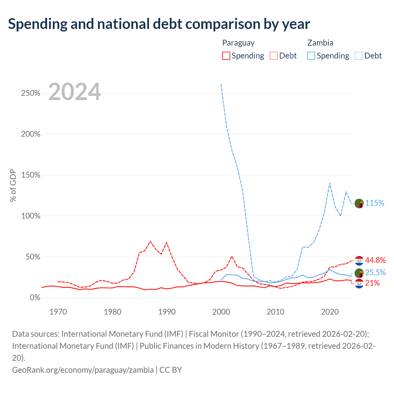 Paraguay has $19.9B in government debt (44.8% of GDP), compared to $29.1B (114.9% of GDP) in Zambia.