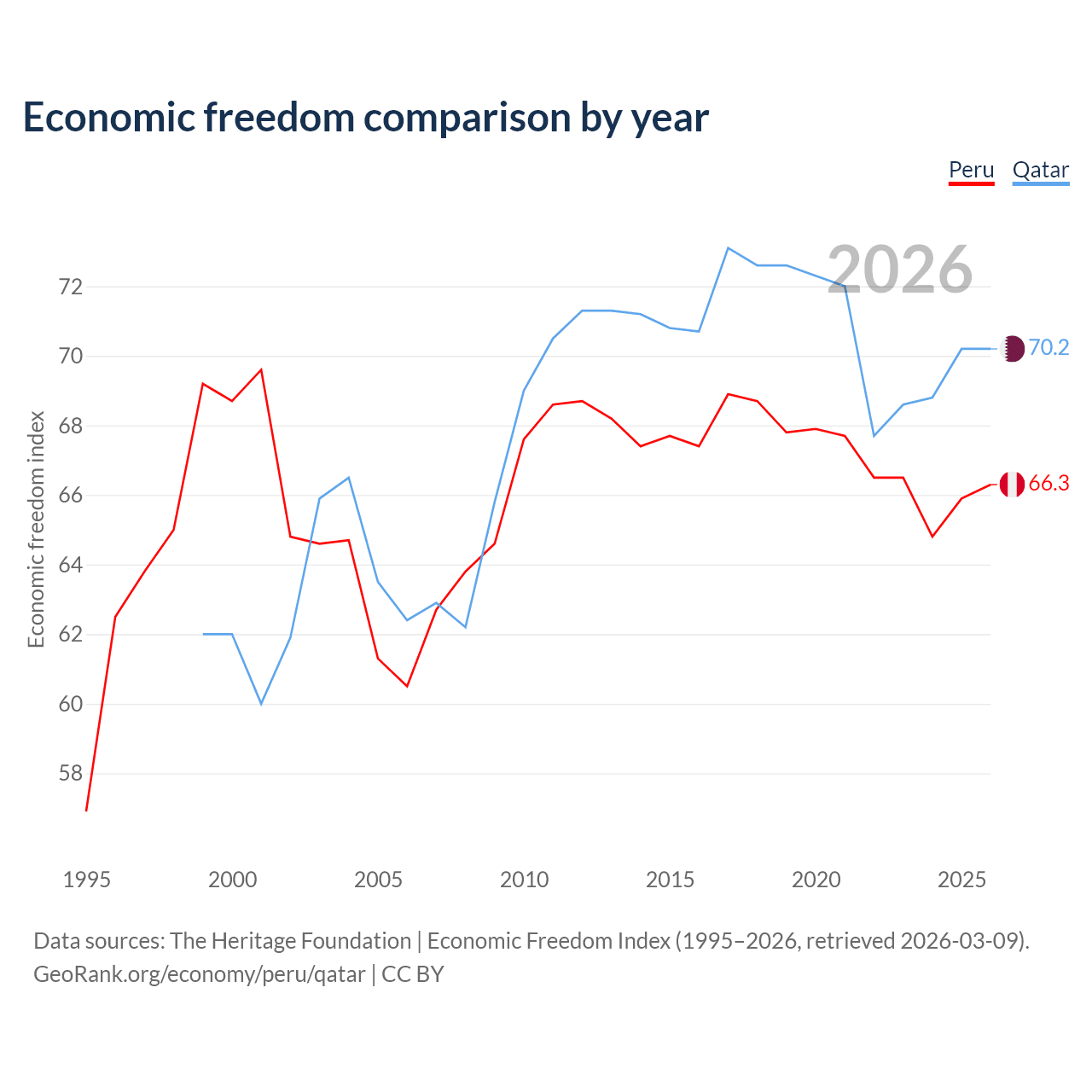 The Economic Freedom Index for Peru is 66.3, ranking 62/197, compared to 70.2 for Qatar, ranking 37/197. The chart above displays a comparison of annual changes in economic freedom indexes.