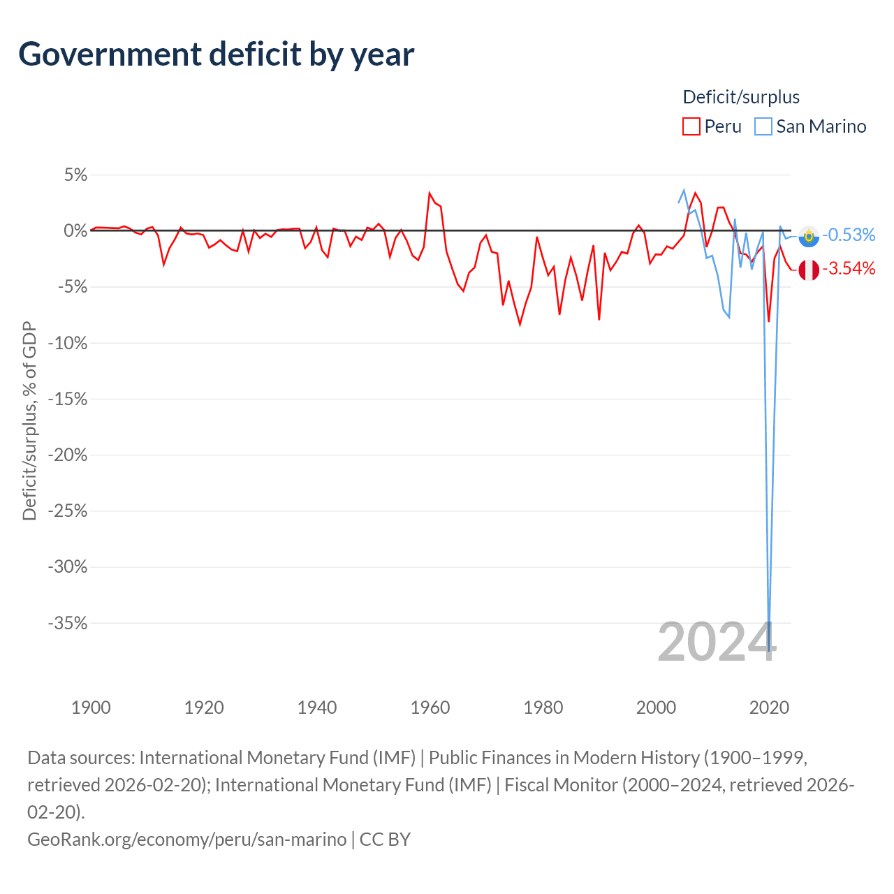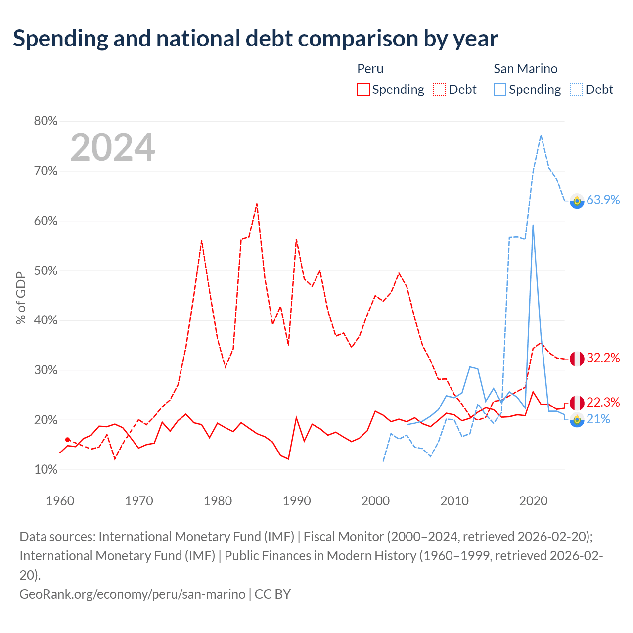 Peru has $93B in government debt (32.2% of GDP), compared to $1.39B (63.9% of GDP) in San Marino.