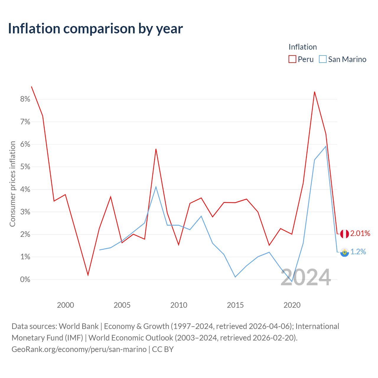 Peru has a GDP of $289B compared to $2.03B for San Marino, ranking 49/197 and 180/197 by economy size, respectively.