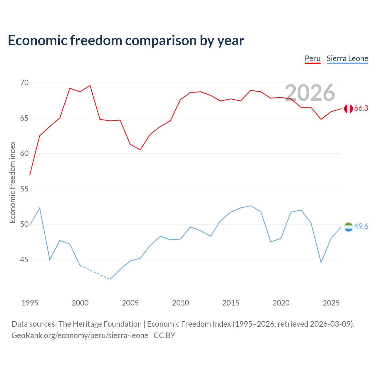 The Economic Freedom Index for Peru is 66.3, ranking 62/197, compared to 49.6 for Sierra Leone, ranking 165/197. The chart above displays a comparison of annual changes in economic freedom indexes.
