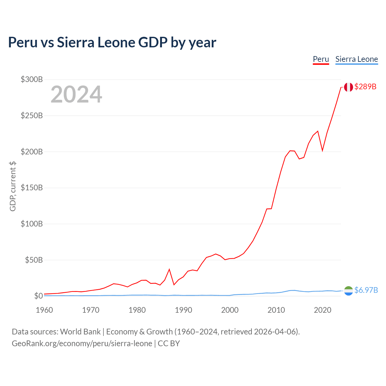 Peru has a GDP of $289B compared to $6.97B for Sierra Leone, ranking 49/197 and 160/197 by economy size, respectively.