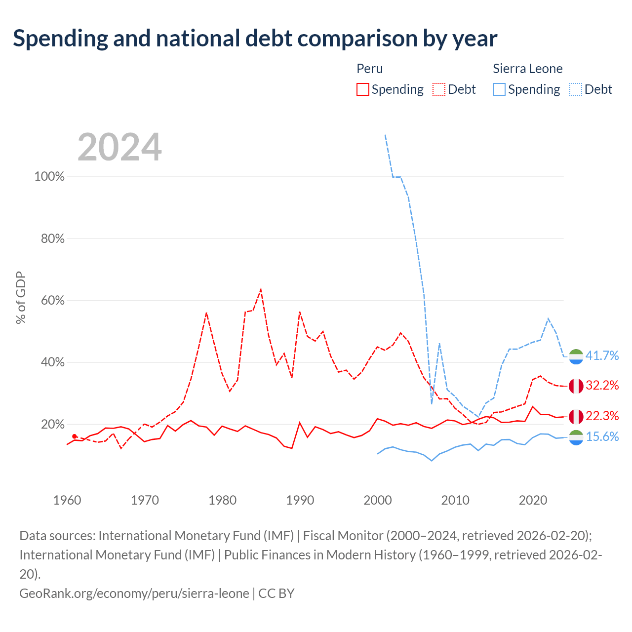 Peru has $93B in government debt (32.2% of GDP), compared to $2.91B (41.7% of GDP) in Sierra Leone.