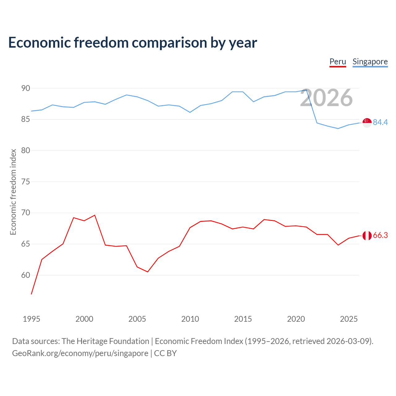 The Economic Freedom Index for Peru is 66.3, ranking 62/197, compared to 84.4 for Singapore, ranking 1/197. The chart above displays a comparison of annual changes in economic freedom indexes.