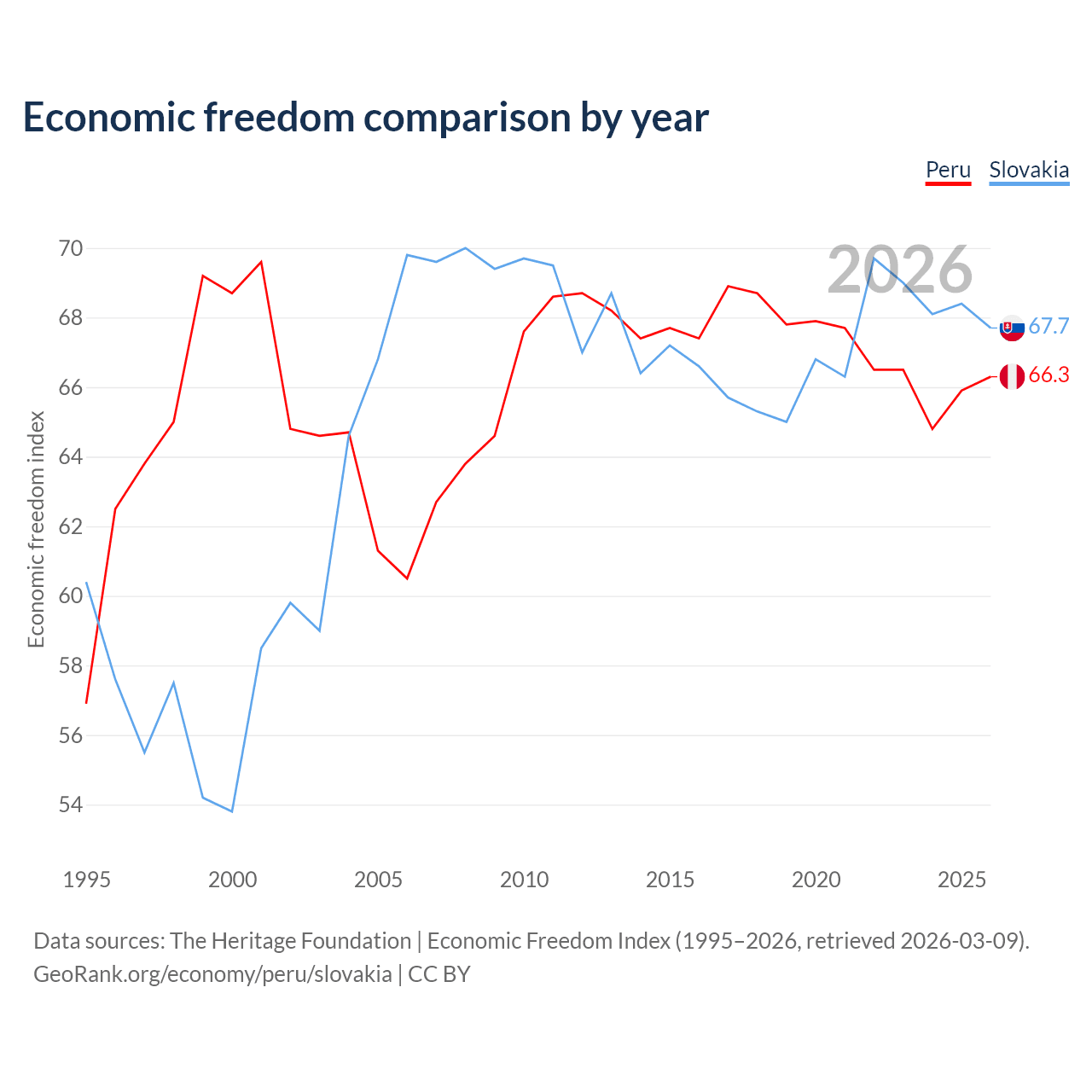 The Economic Freedom Index for Peru is 66.3, ranking 62/197, compared to 67.7 for Slovakia, ranking 54/197. The chart above displays a comparison of annual changes in economic freedom indexes.