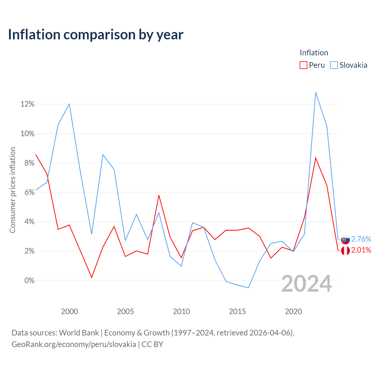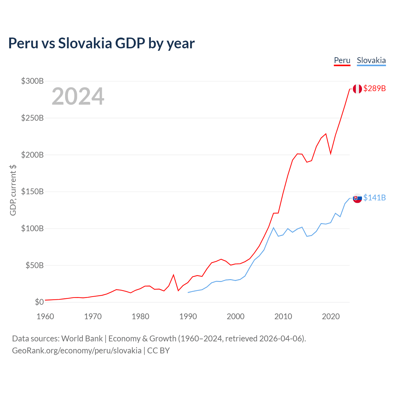 Peru has a GDP of $289B compared to $141B for Slovakia, ranking 49/197 and 61/197 by economy size, respectively.