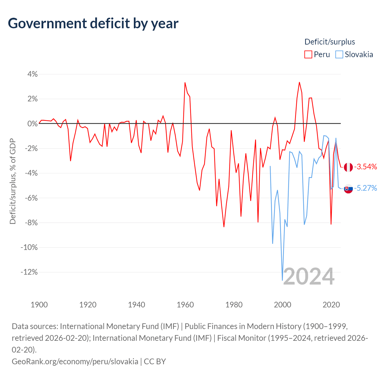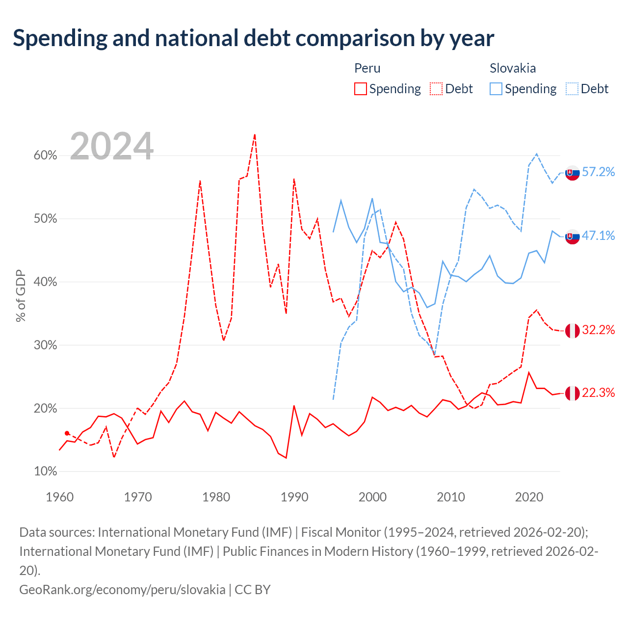 Peru has $93B in government debt (32.2% of GDP), compared to $80.7B (57.2% of GDP) in Slovakia.