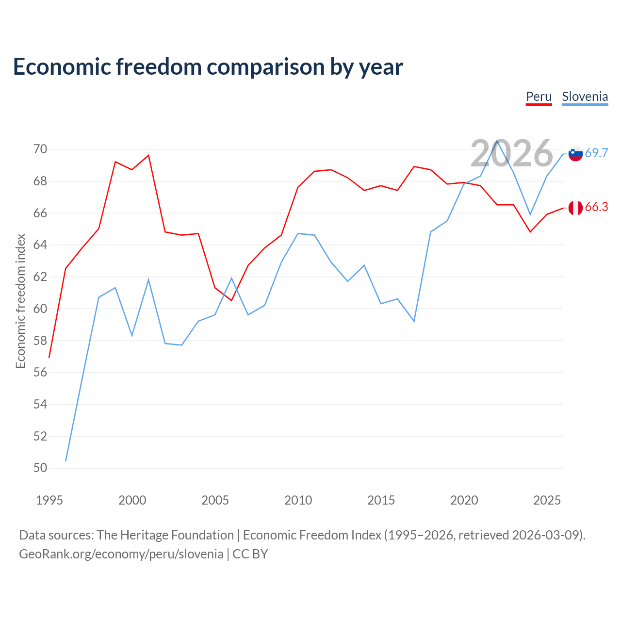 The Economic Freedom Index for Peru is 66.3, ranking 62/197, compared to 69.7 for Slovenia, ranking 40/197. The chart above displays a comparison of annual changes in economic freedom indexes.