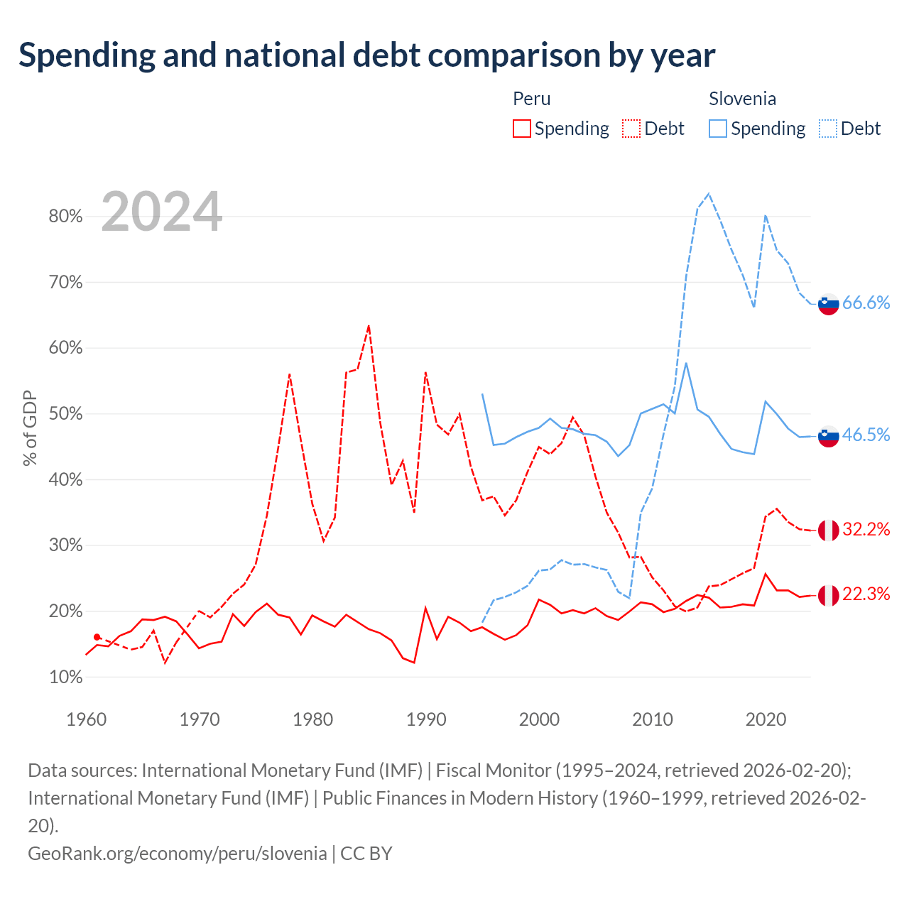 Peru has $93B in government debt (32.2% of GDP), compared to $48.6B (66.6% of GDP) in Slovenia.