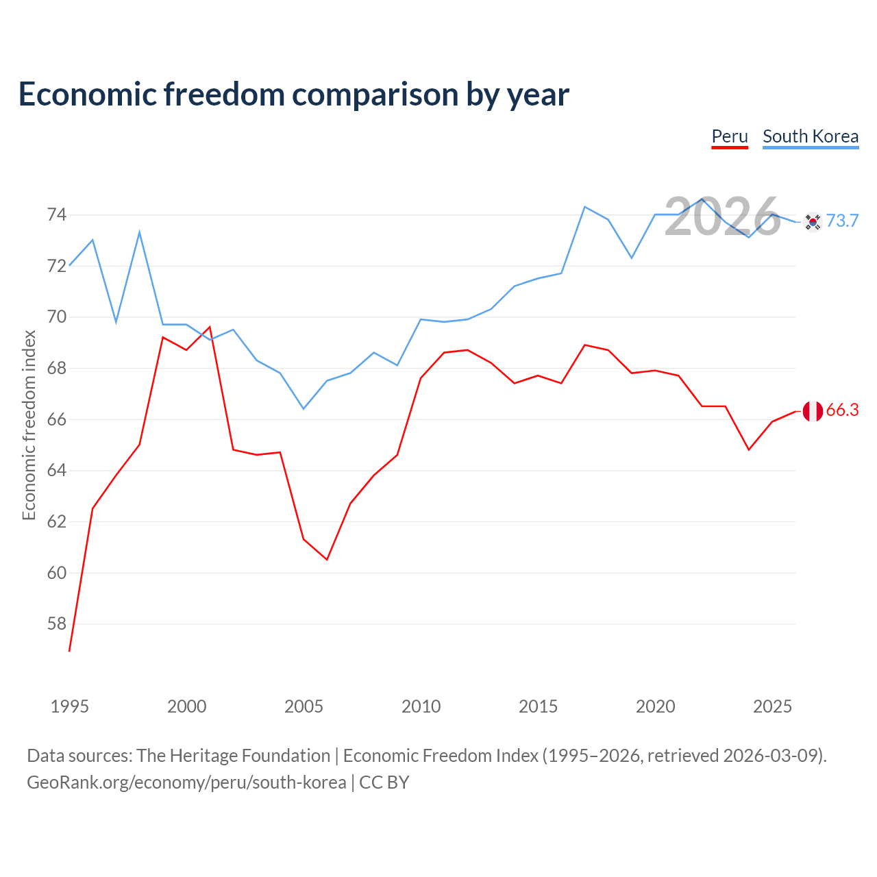 The Economic Freedom Index for Peru is 66.3, ranking 62/197, compared to 73.7 for South Korea, ranking 24/197. The chart above displays a comparison of annual changes in economic freedom indexes.