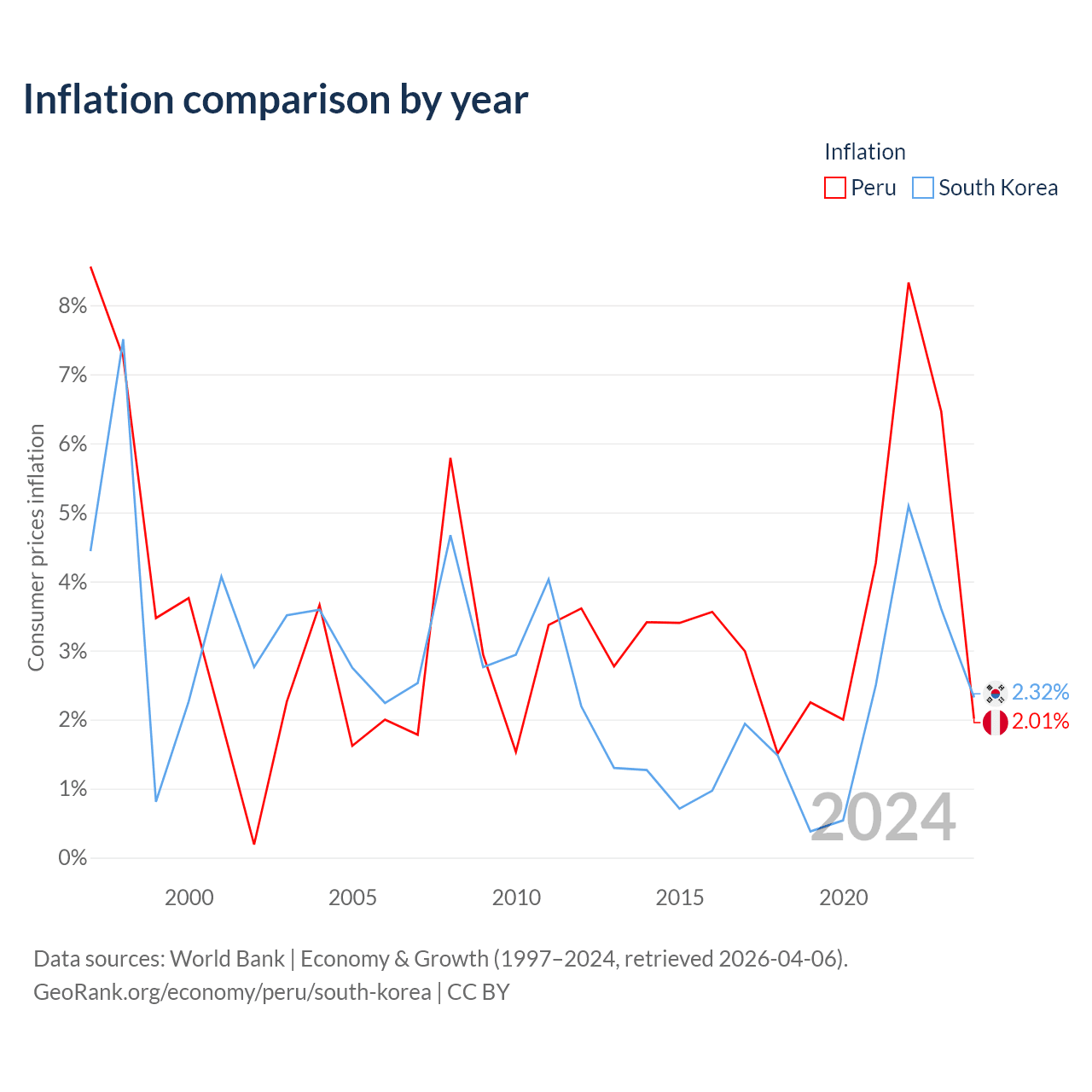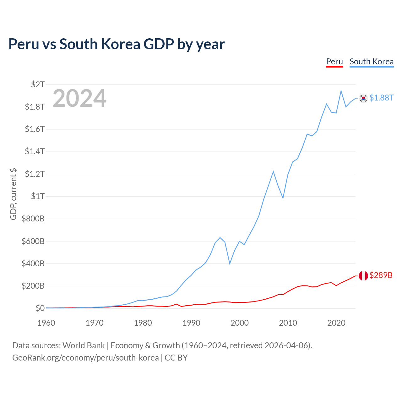 Peru has a GDP of $289B compared to $1.88T for South Korea, ranking 49/197 and 12/197 by economy size, respectively.