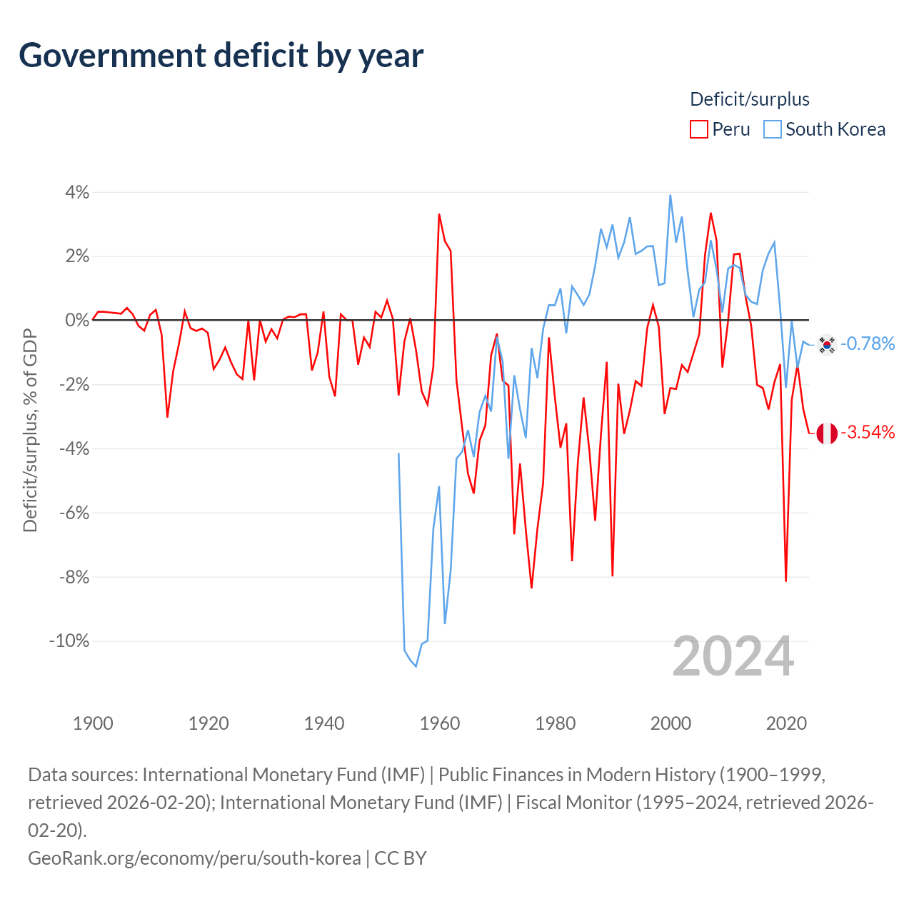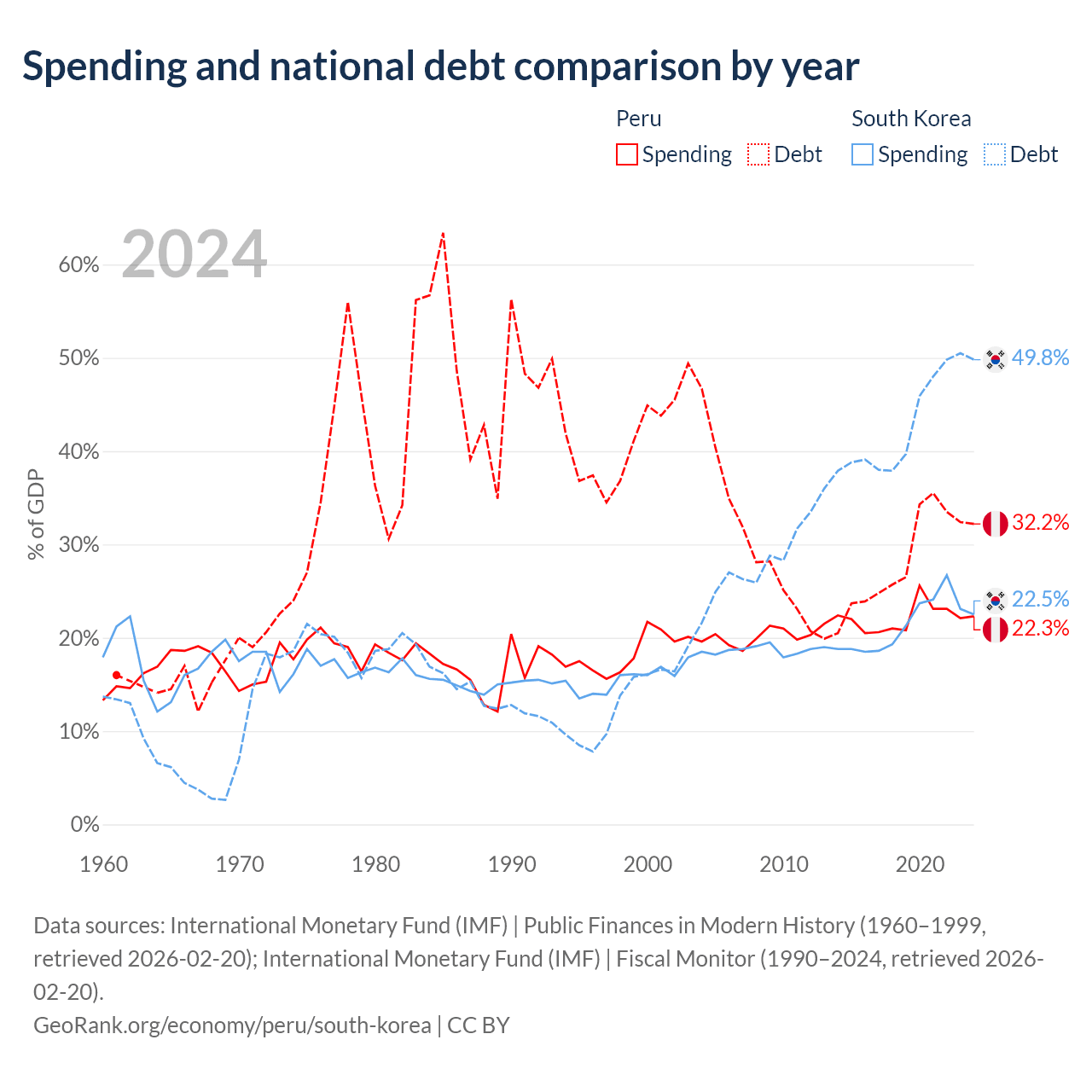 Peru has $93B in government debt (32.2% of GDP), compared to $934B (49.8% of GDP) in South Korea.