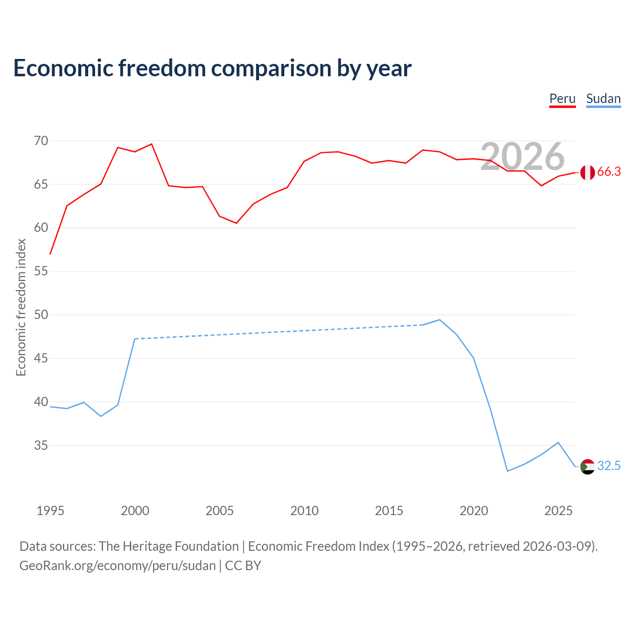 The Economic Freedom Index for Peru is 66.3, ranking 62/197, compared to 32.5 for Sudan, ranking 191/197. The chart above displays a comparison of annual changes in economic freedom indexes.
