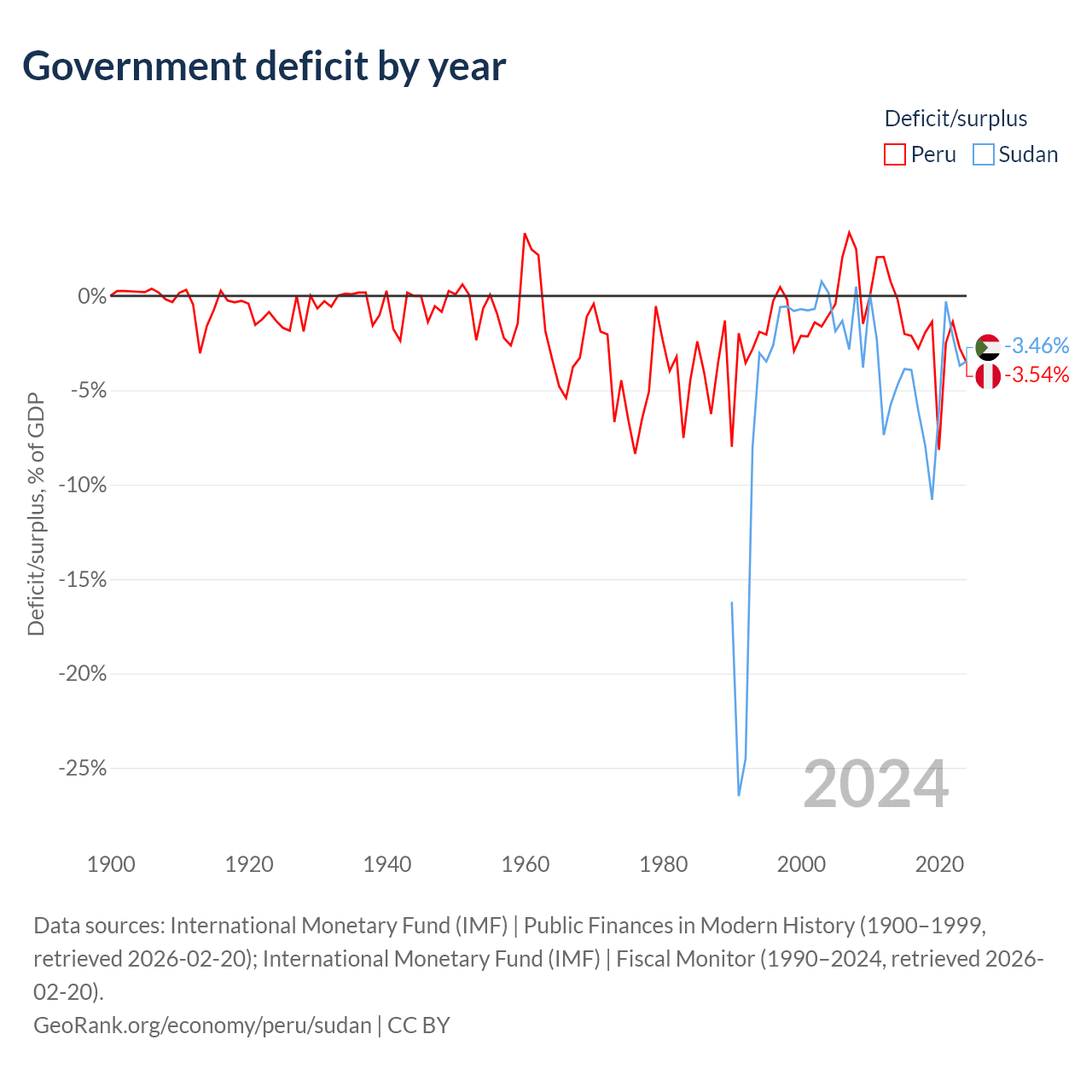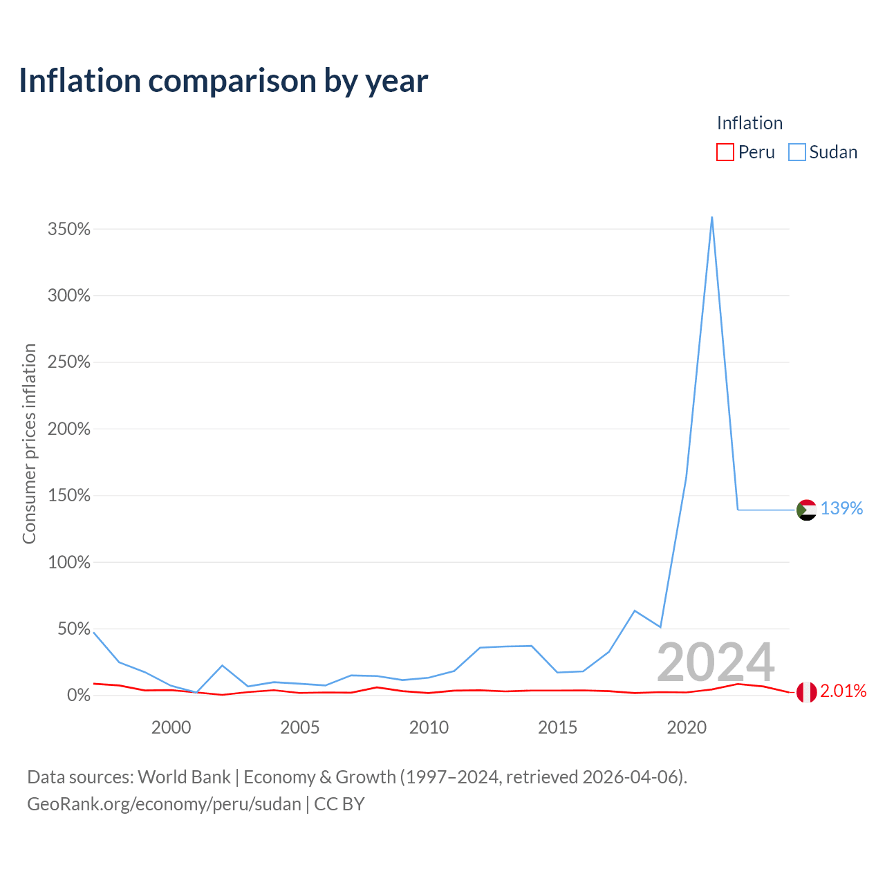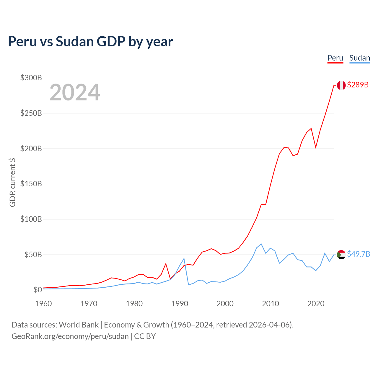 Peru has a GDP of $289B compared to $49.7B for Sudan, ranking 49/197 and 94/197 by economy size, respectively.