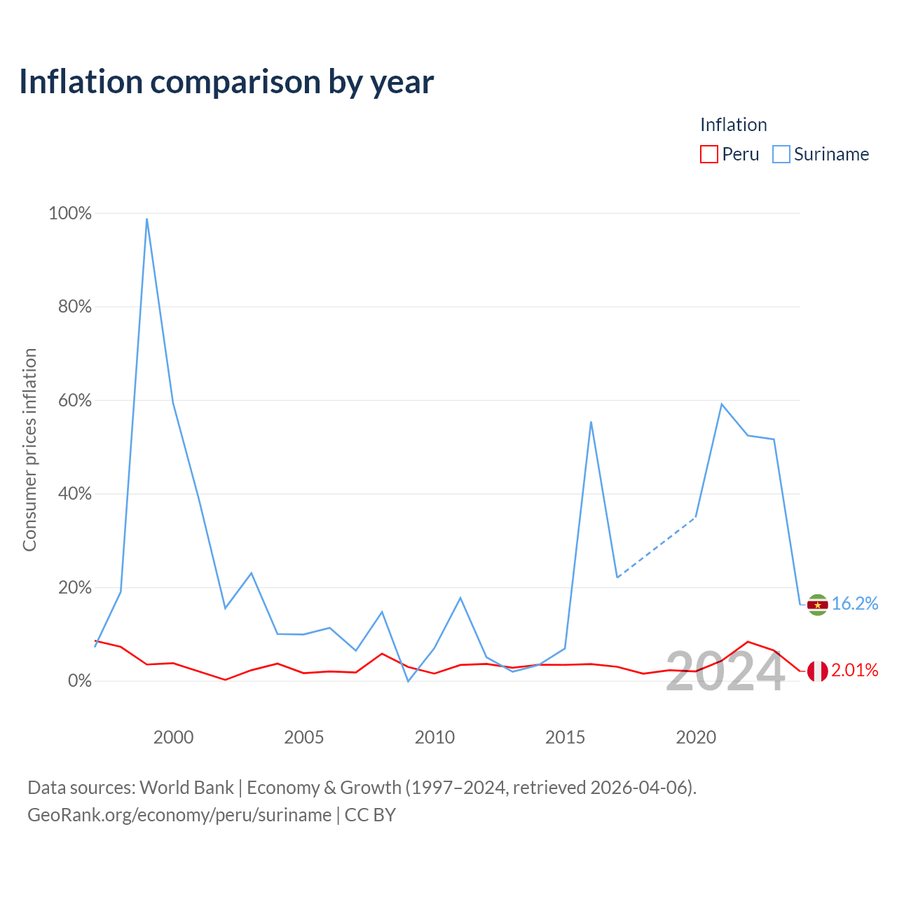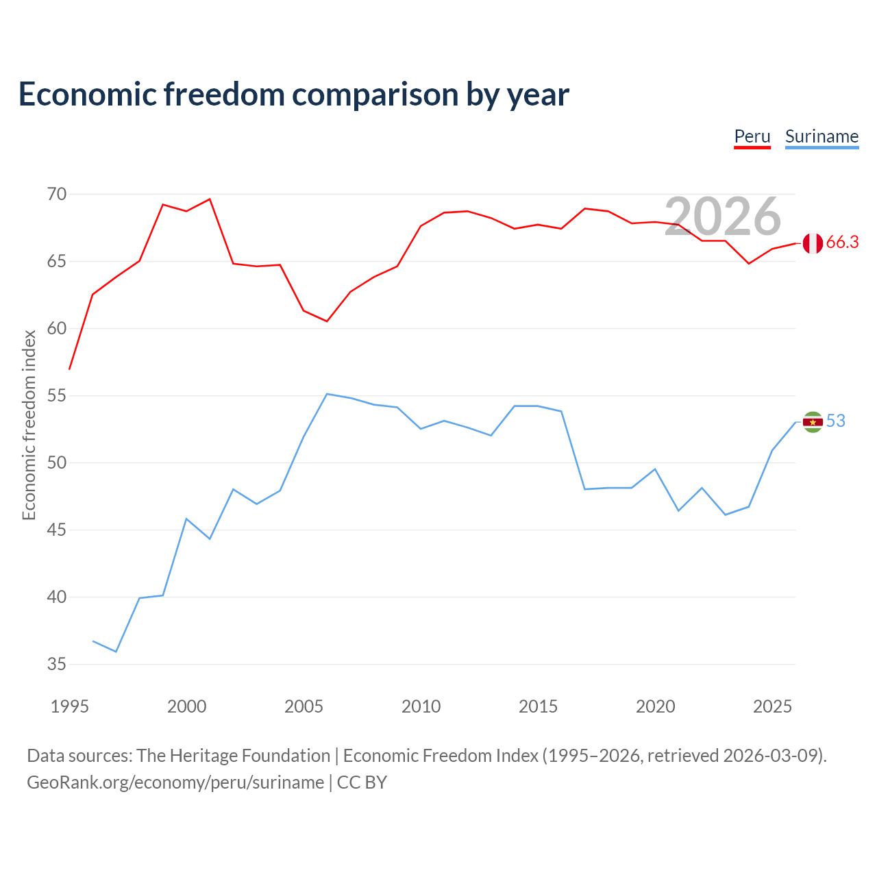The Economic Freedom Index for Peru is 66.3, ranking 62/197, compared to 53 for Suriname, ranking 143/197. The chart above displays a comparison of annual changes in economic freedom indexes.